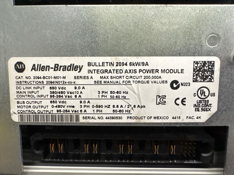 Allen-Bradley integrated power supply/servo drive module, mod. Kinetic 6200/6500, 6 kW converter, 400/460V w/ Kinetix 6X00 Bulletin 2094, 6 kW, 9A [Loc. Maintenance]