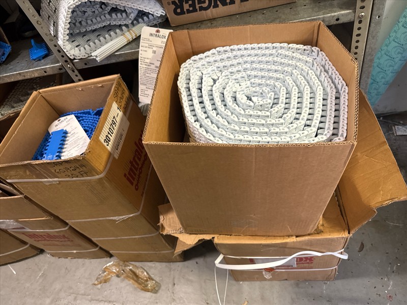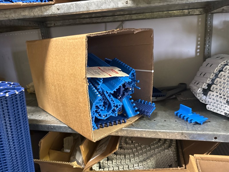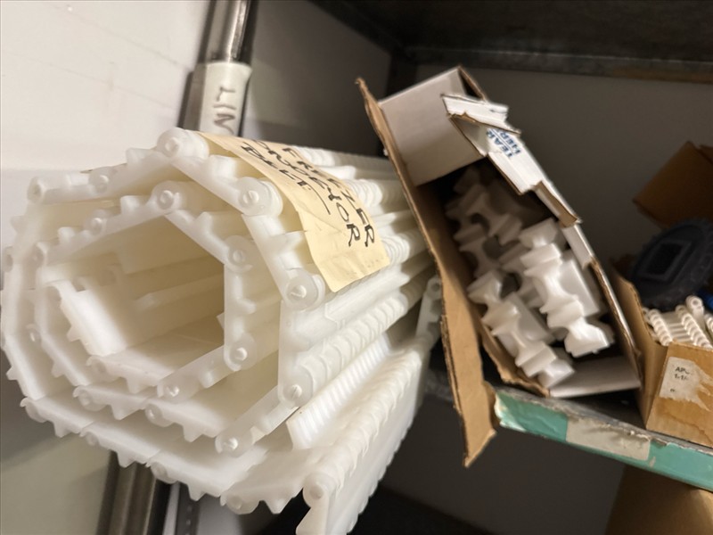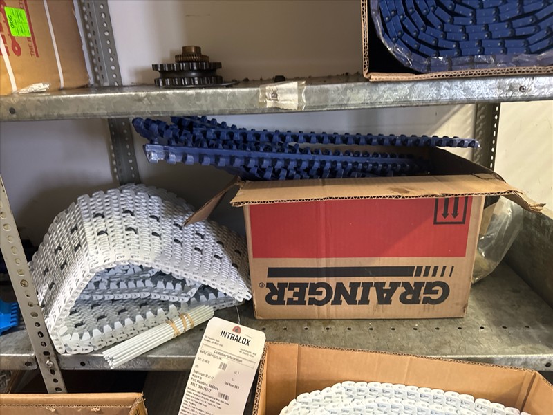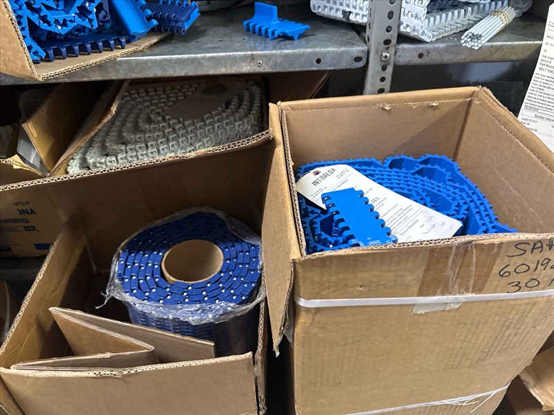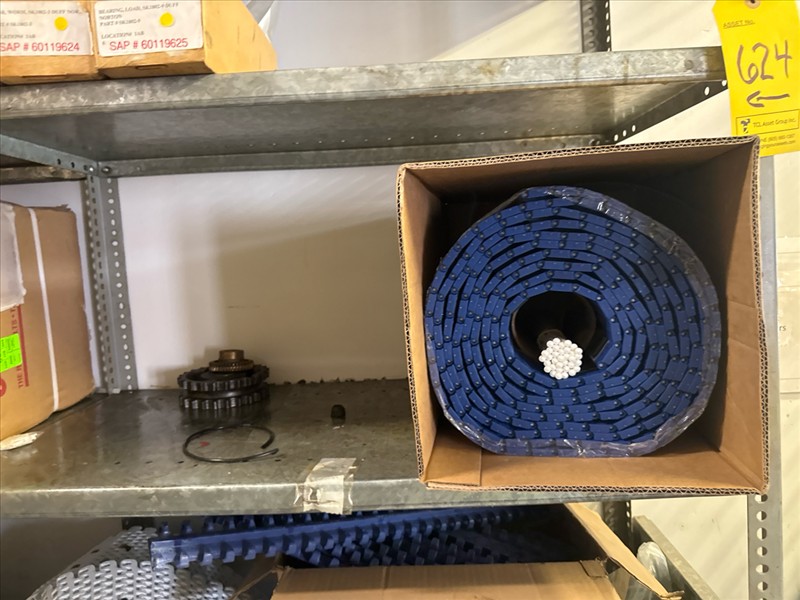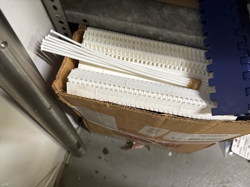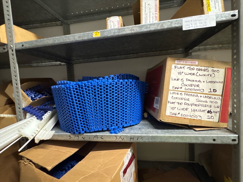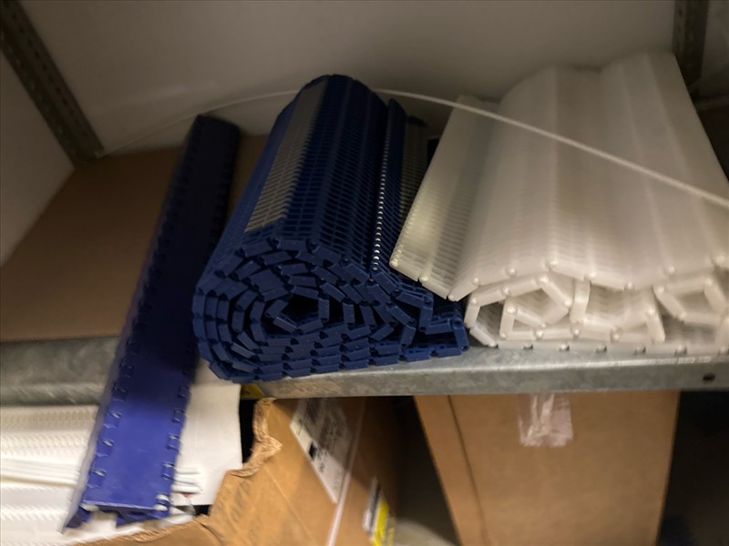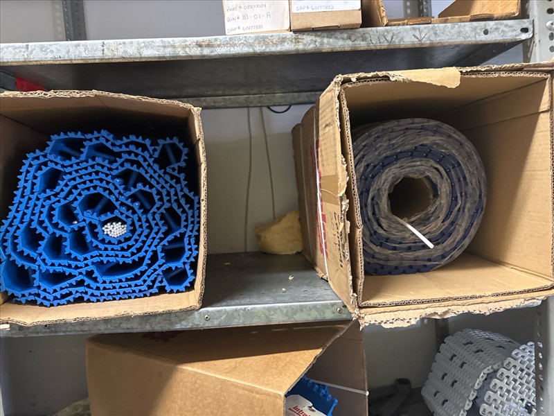 contents of racking: misc. conveyor belting, etc. (Rack Line 1, sec. A-E and Rack Line 2, sec. C-D) [Loc. Stores]