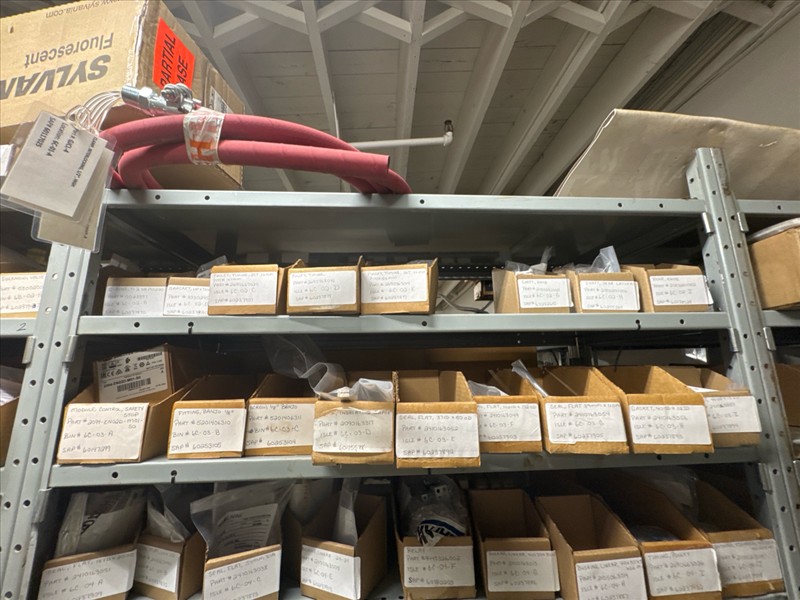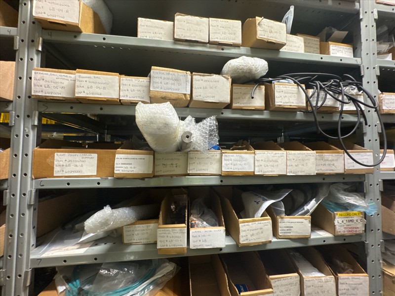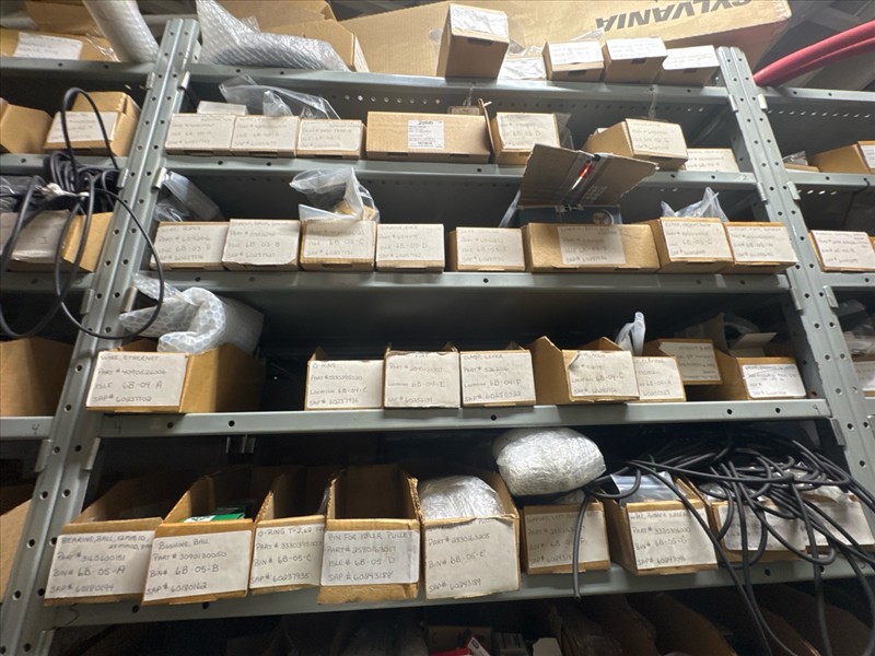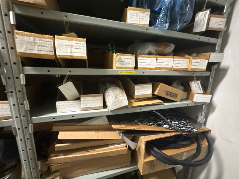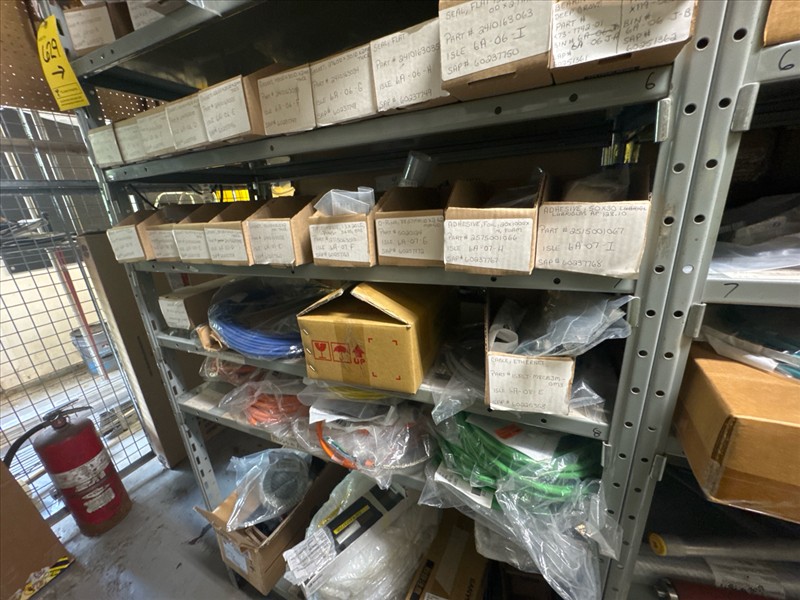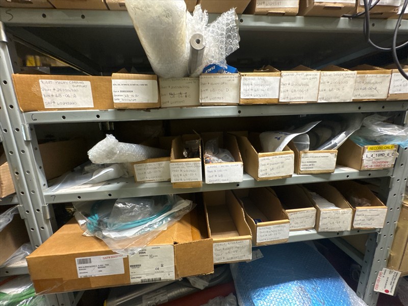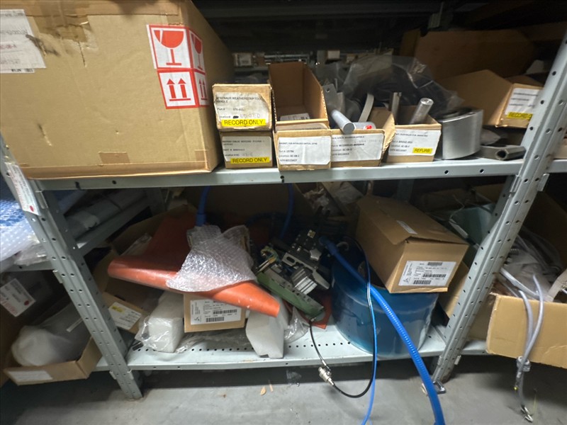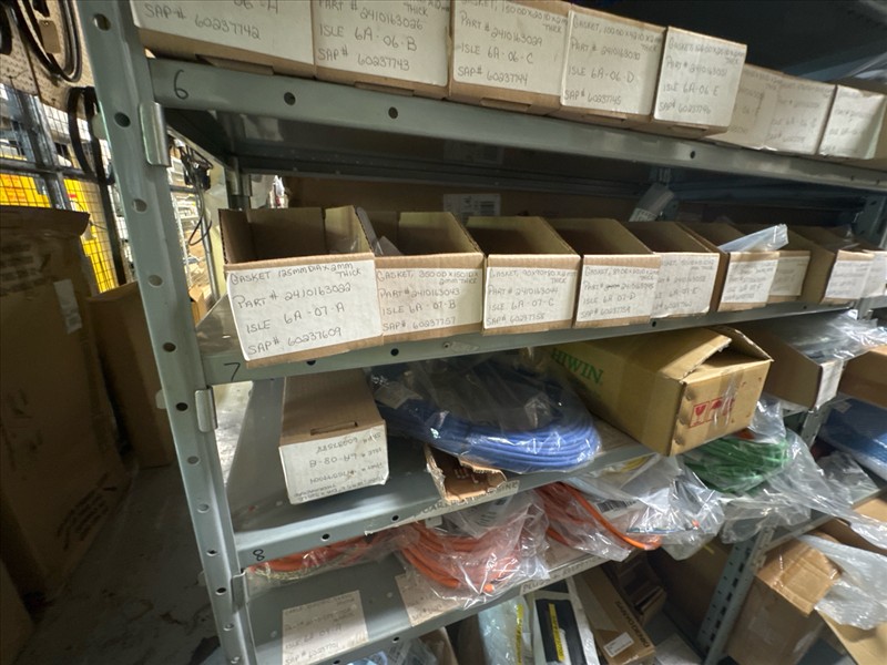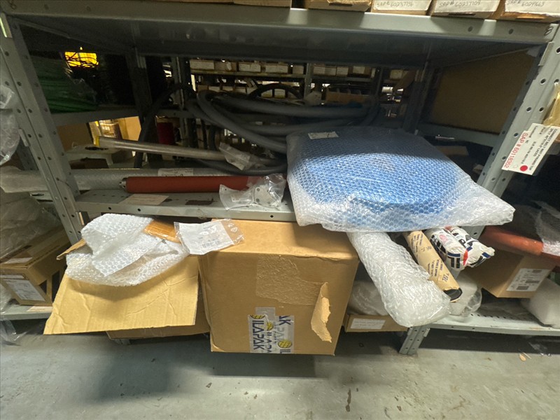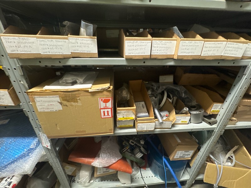 contents of racking: misc. Illapak, Ishida, Taconic, rubber channel spare parts, etc. (Rack Line 6, sec. A-D) [Loc. Stores]