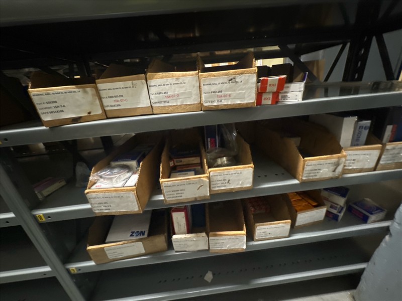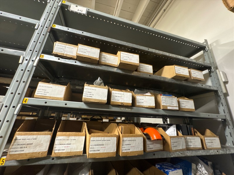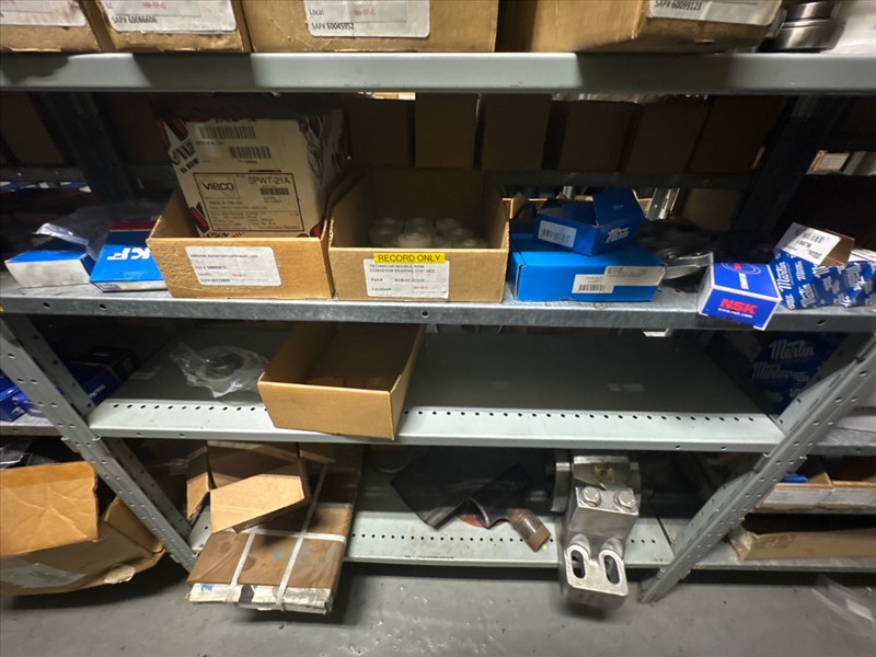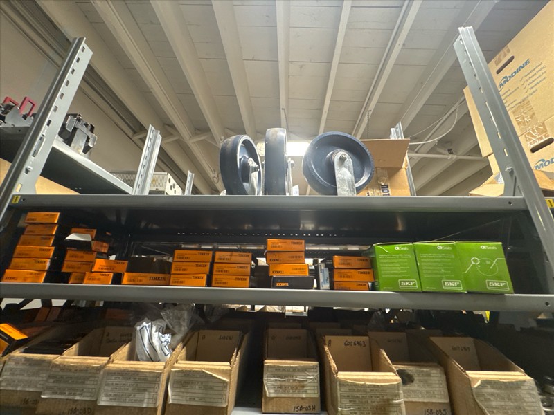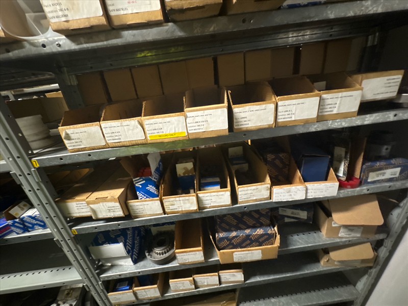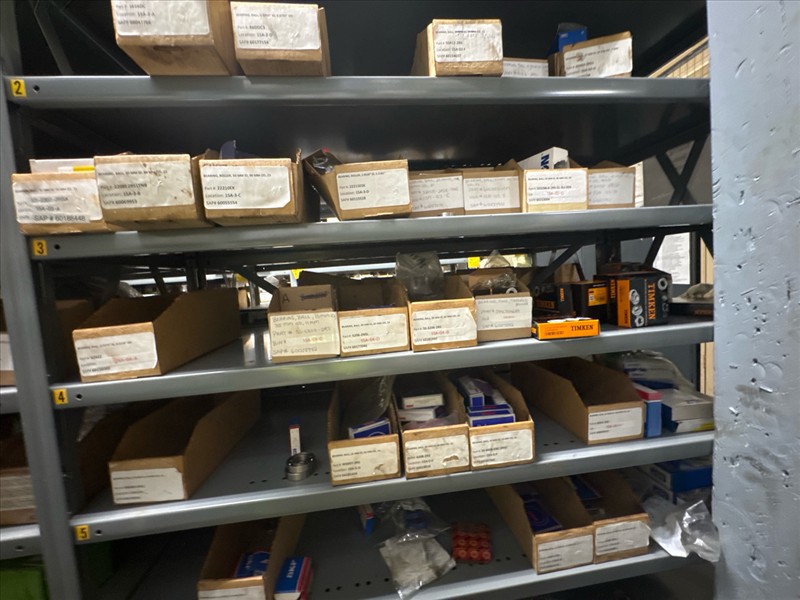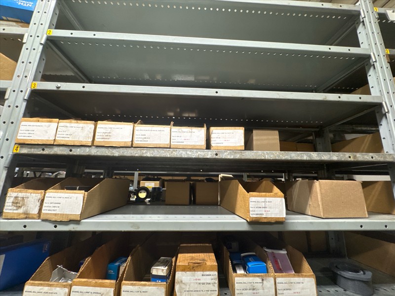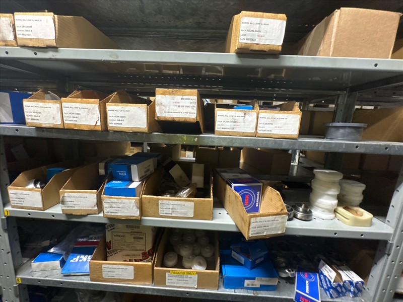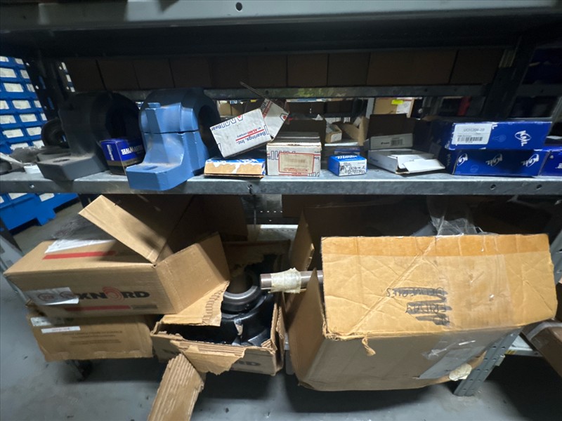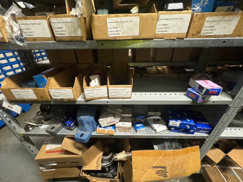 contents of racking: misc. bearings, seals, collars, pillow blocks, bearing inserts, drive couplers, sider inserts, etc. (Rack Line 15, sec. A-B and Rack Line 16, sec. A-C) [Loc. Stores]