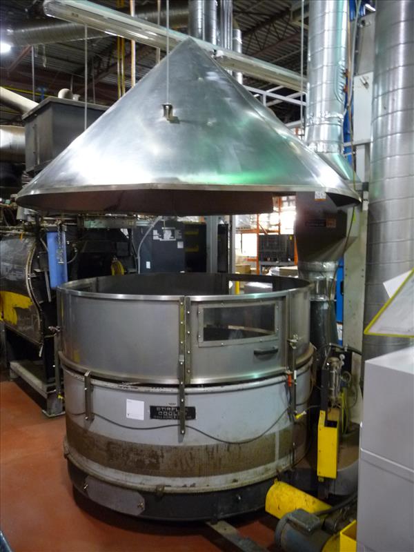 Jabez Burns cooler/stirrer/de-stoner model Stirflex c/w airveying discharge duct, Eriez magnet model 20" RE RPS, style 9706716, w/ s/s enclosure, & s/s hood w/ lighting