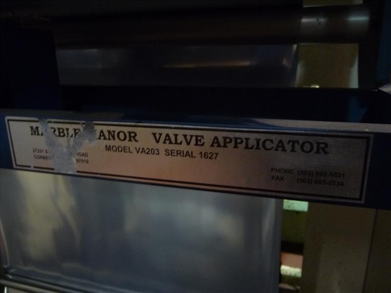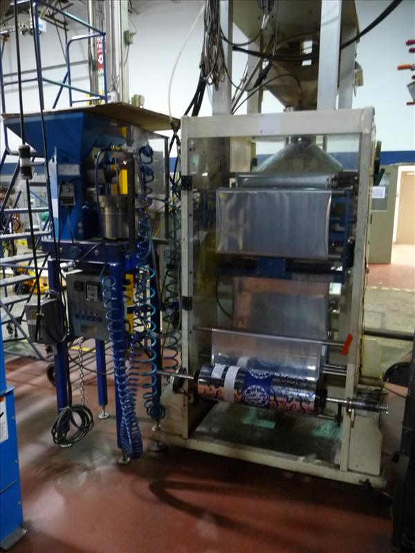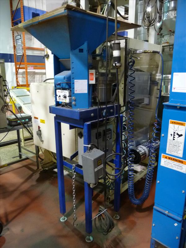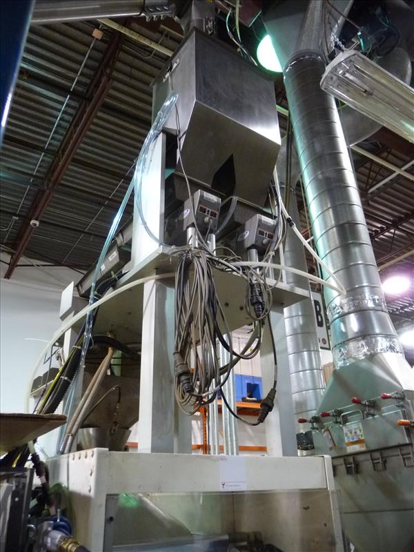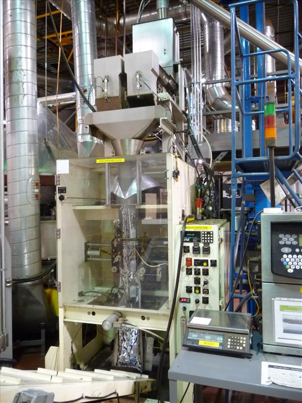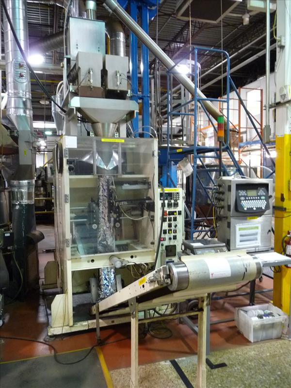 Key-Pak Machines vertical form-fill-seal bagging machine, model EL-1200, ser. no. 405, c/w Marble Manor 2-way vent Fresco Valve applicator model VA203, ser. no. 1627, (2) Syntron vibratory magnetic scale feeders model HP-1, (2) scales, (1) California vibratory valve bowl feeder, nitrogen flush, (was filling whole roasted beans in 5 lb. bags) (Key Pak #3)