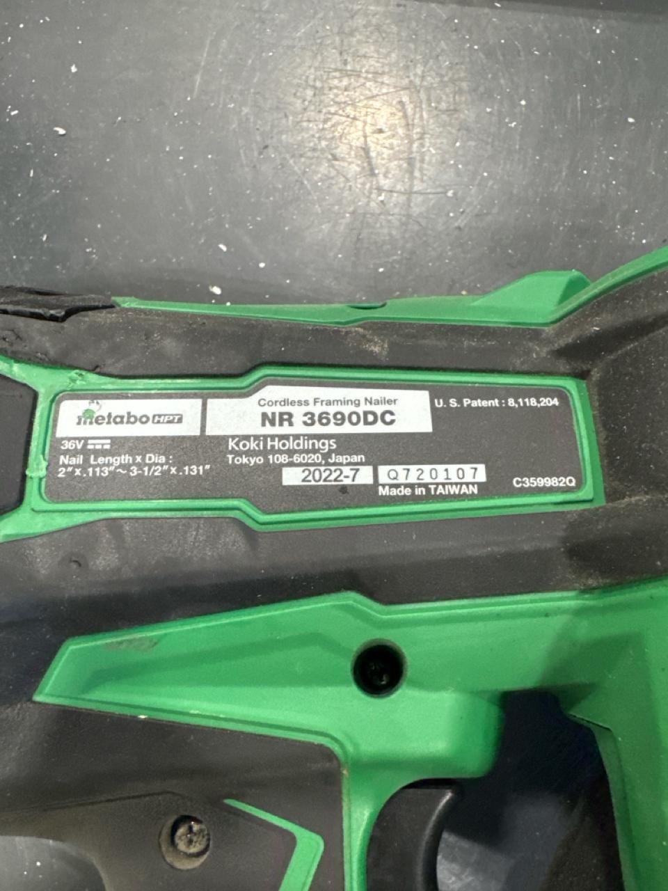 Metabo HPT cordless framing nailer, mod. NR3690DC, 35/18V c/w (1) battery and (1) charger [Loc. Tool Crib]
