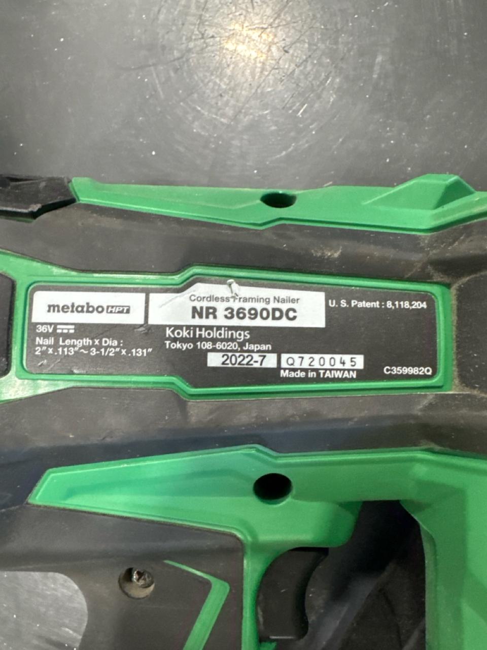 Metabo HPT cordless framing nailer, mod. NR3690DC, 35/18V c/w (1) battery and (1) charger [Loc. Tool Crib]