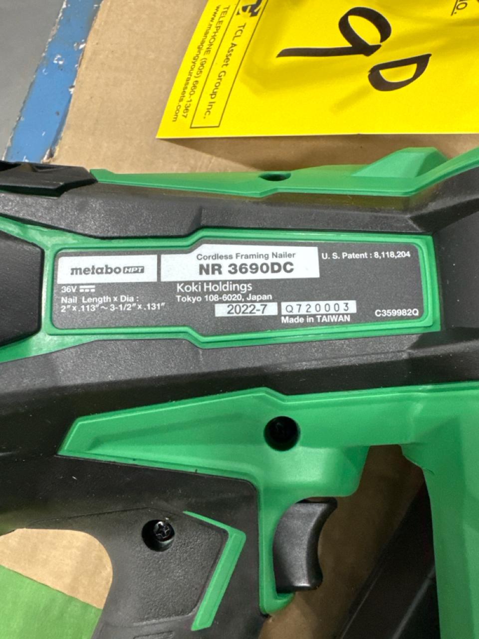Metabo HPT cordless framing nailer, mod. NR3690DC, 35/18V c/w (1) battery and (1) charger [Loc. Tool Crib]
