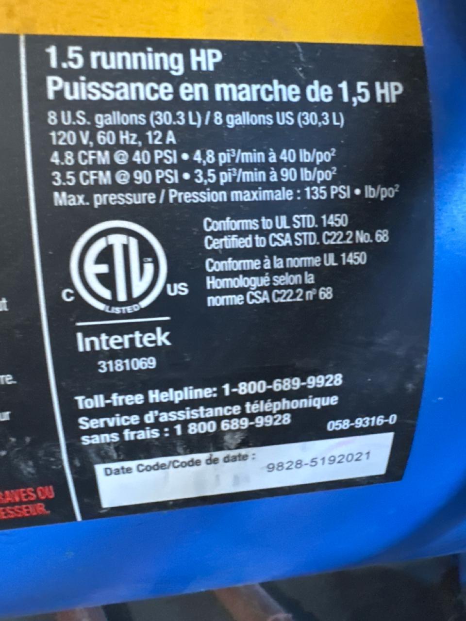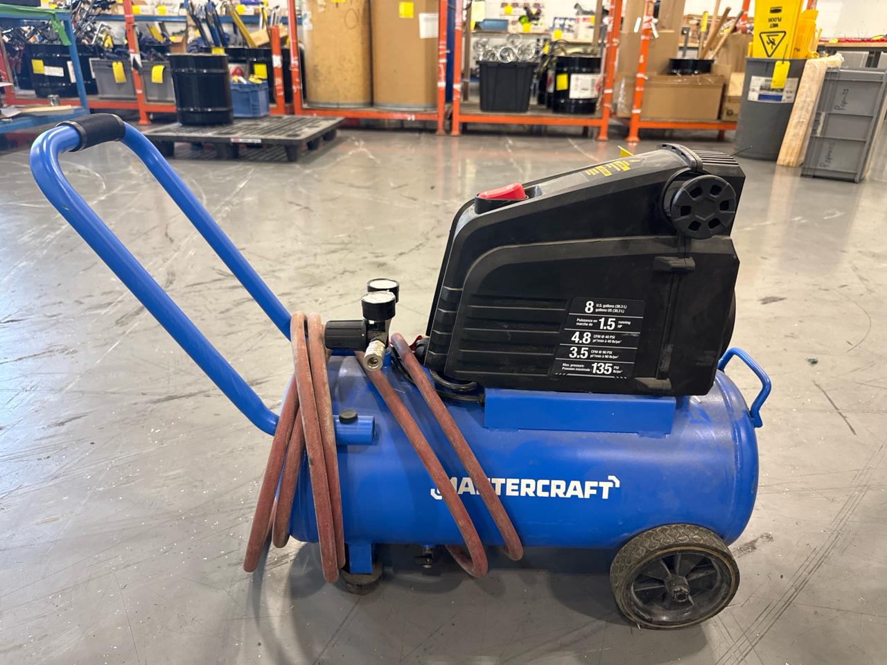 MasterCraft portable air compressor, 1.5 hp, 8 gal., 135 psi [Loc. Tool Crib]