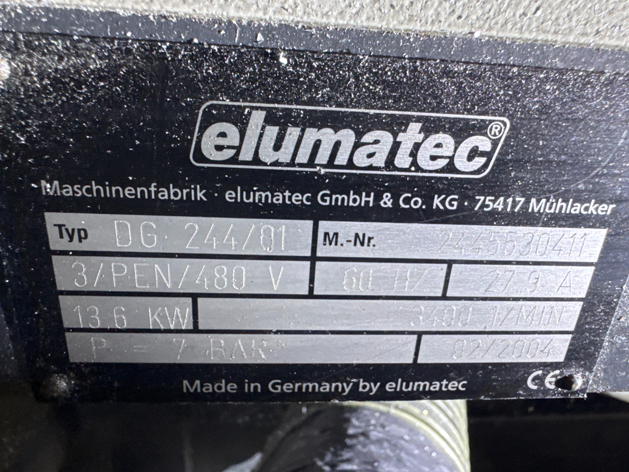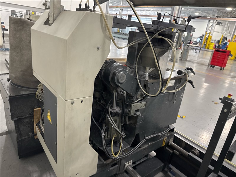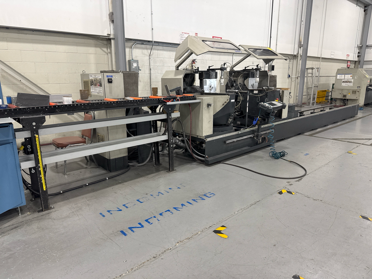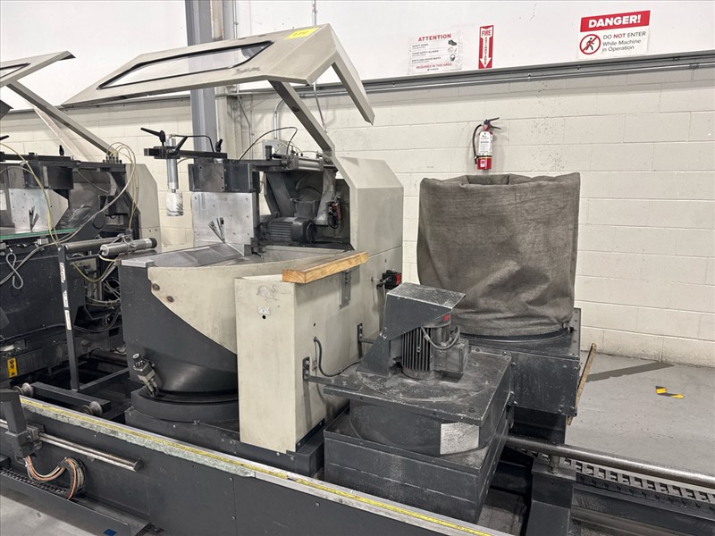 Elumatec Double-Head Miter Saw (5-axis, 6m), mod. DG244/01, ser. no. 2445530411, w/ approx. 20 ft. rail, PLC panel, E550 controls, dual dust collectors, infeed/outfeed conveyors [Loc. Fabrication]