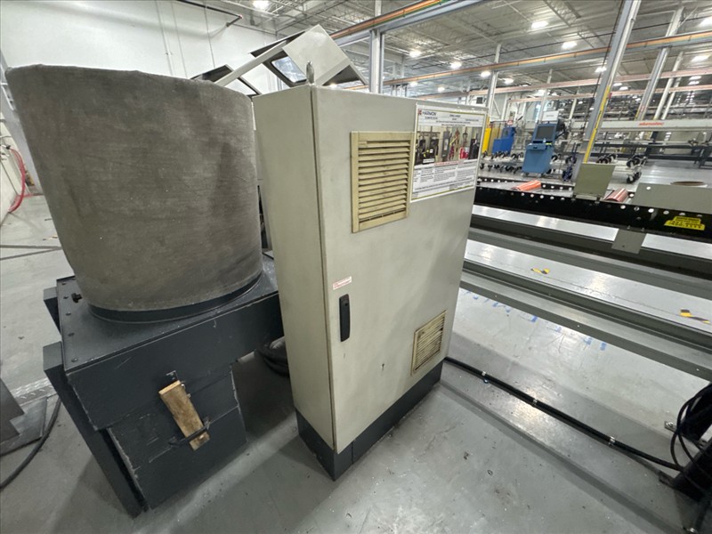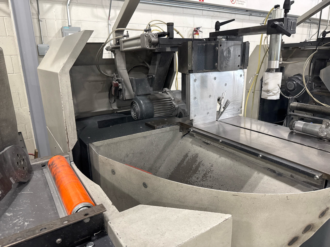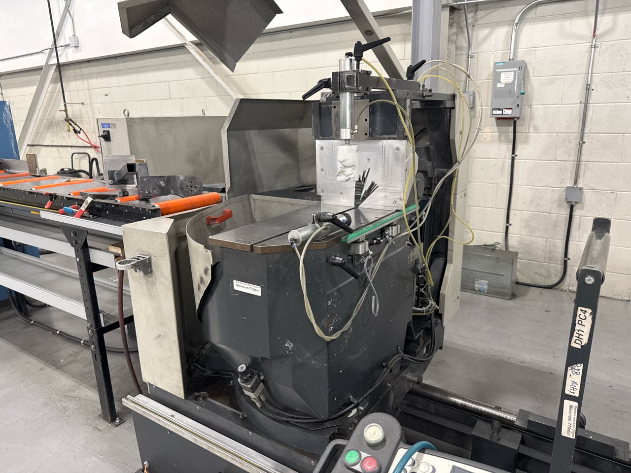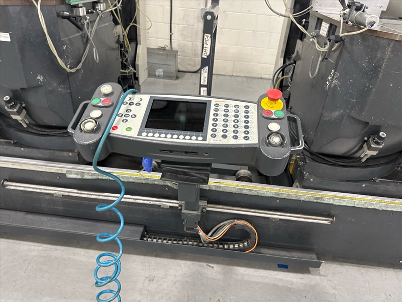 Elumatec Double-Head Miter Saw (5-axis, 6m), mod. DG244/01, ser. no. 2445530411, w/ approx. 20 ft. rail, PLC panel, E550 controls, dual dust collectors, infeed/outfeed conveyors [Loc. Fabrication]