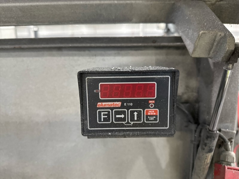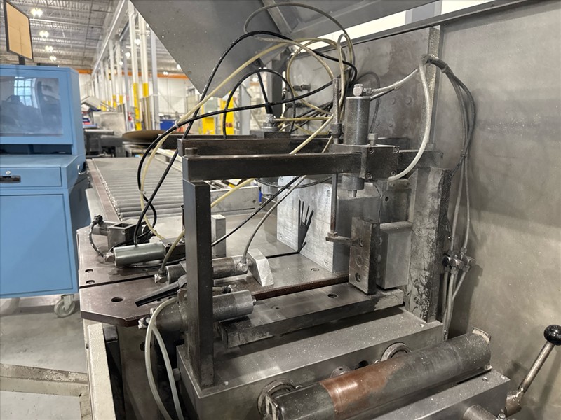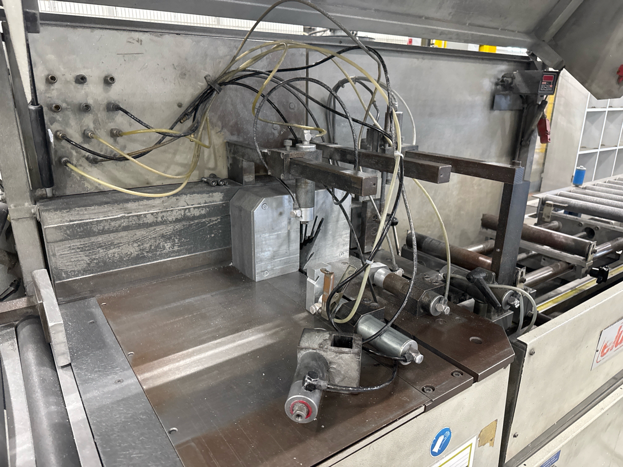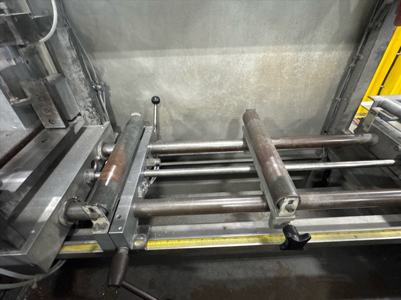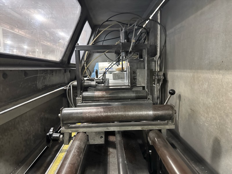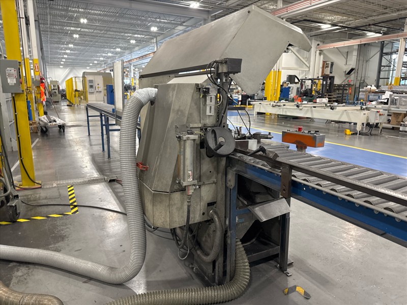 Elumatec Auto-Feeding Saw, mod. SA142/35, ser. no. 30018, w/ mobile dust collector, 12 in. x 120 in. infeed/outfeed conveyor [Loc. Fabrication]