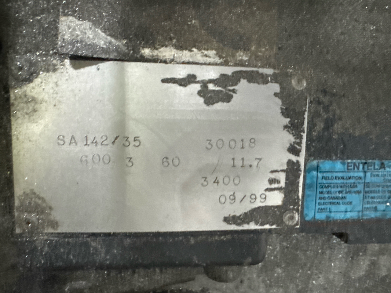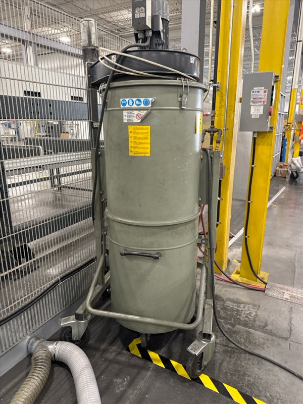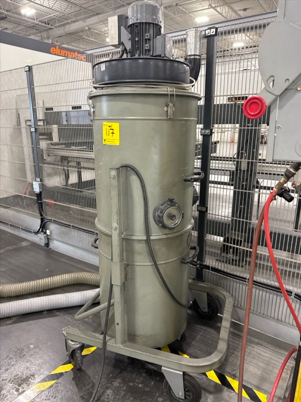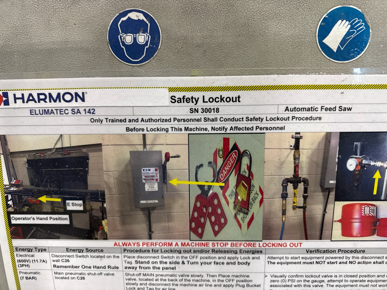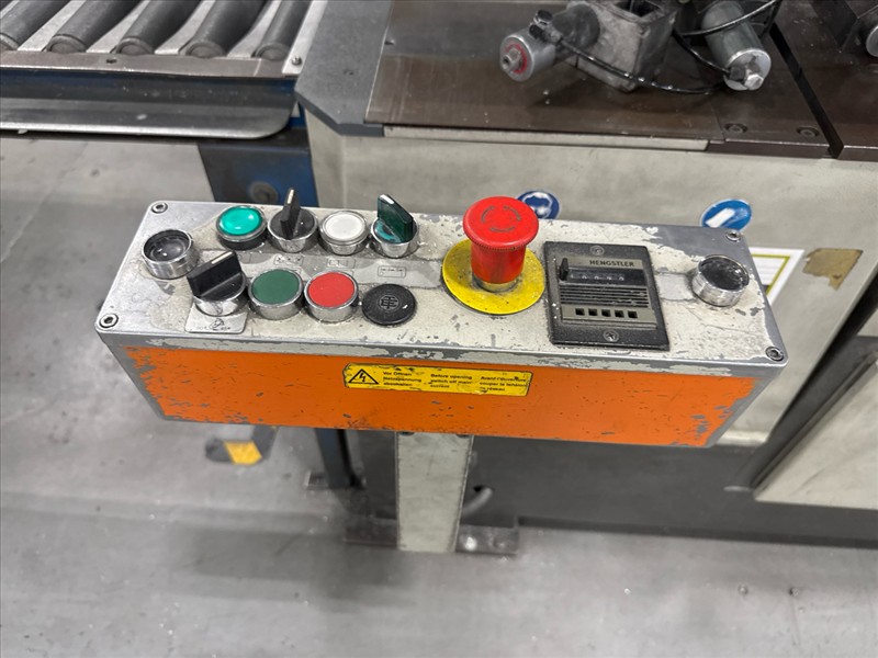Elumatec Auto-Feeding Saw, mod. SA142/35, ser. no. 30018, w/ mobile dust collector, 12 in. x 120 in. infeed/outfeed conveyor [Loc. Fabrication]