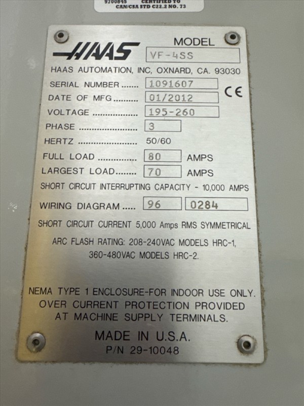 HAAS CNC, mod. VF-4SS, ser. no. 1091607, w/ 24-position tool changer c/w coolant pump, 45 kva transformer (excl. rotary table) [Loc. Fabrication]