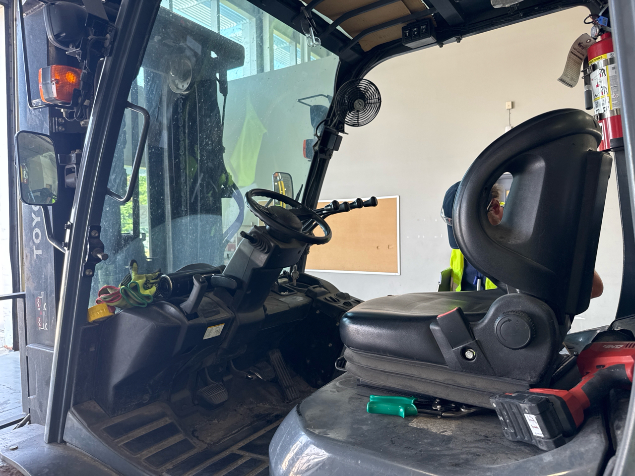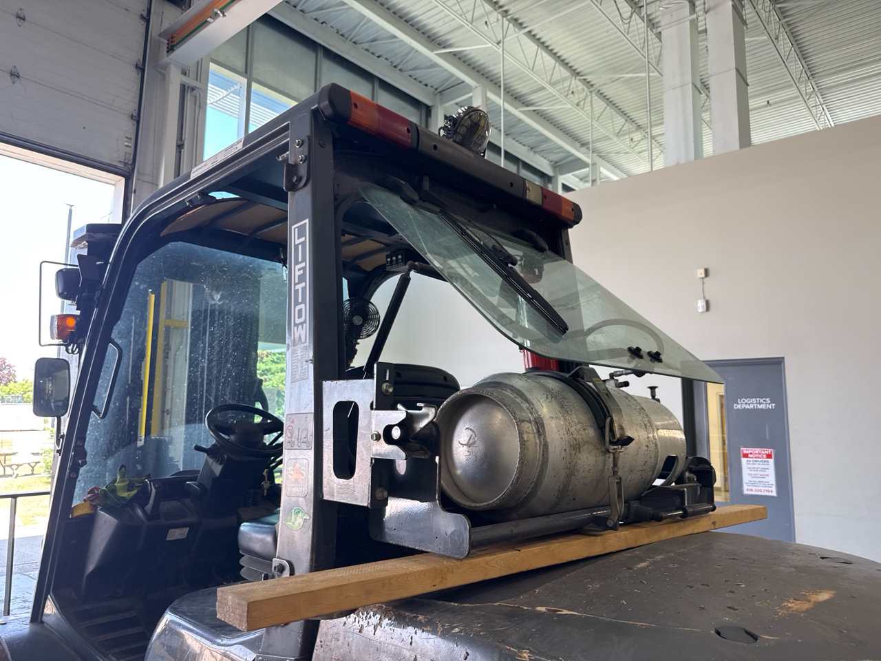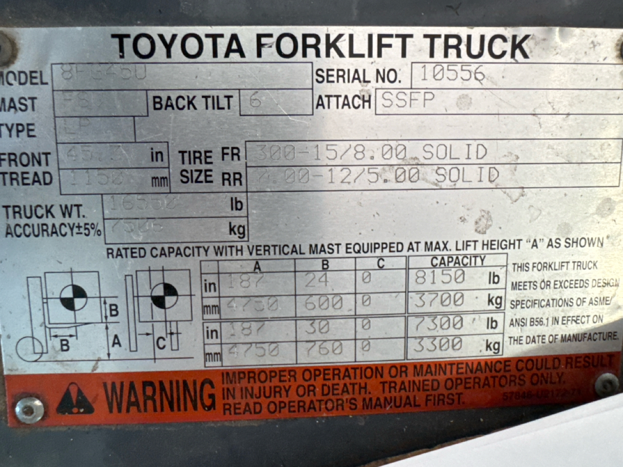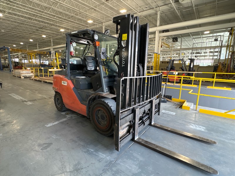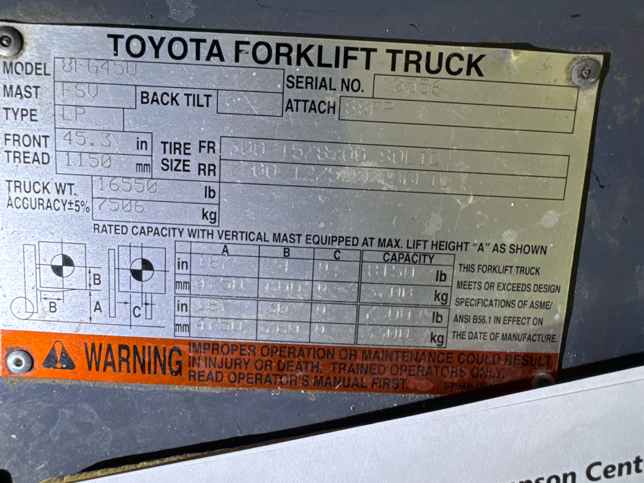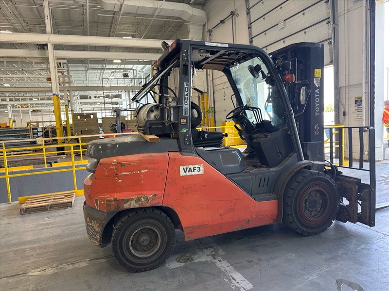 Toyota Fork Lift Truck, mod. 8FG45U, ser. no. 10556, LPG, 9610 hrs., 8000 lbs, cap., 187 in. lift height, 3-stage, side-shift, 72 in. fork-positioner, enclosed cab, pneumatic tires [Loc. Mat. Hand.]