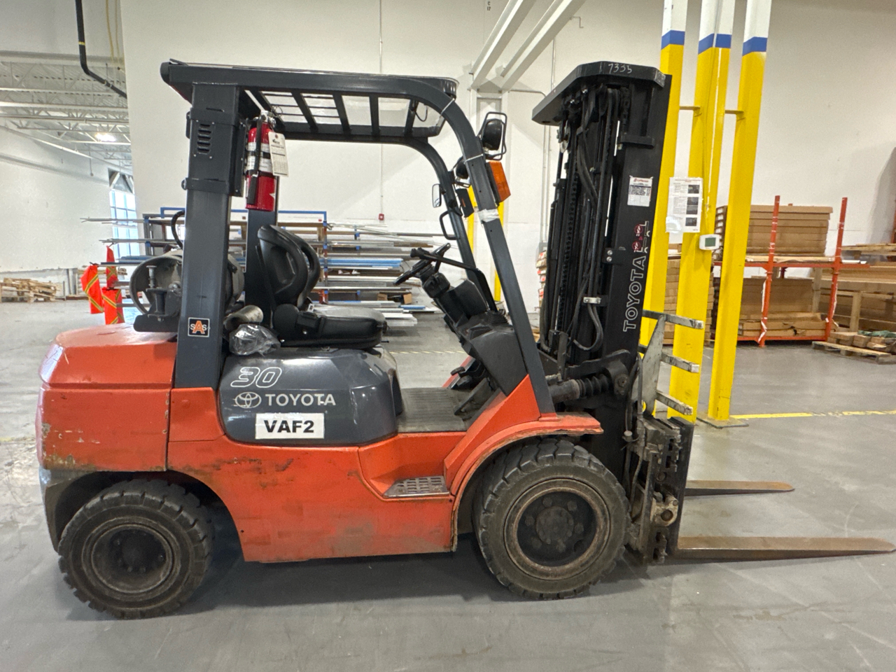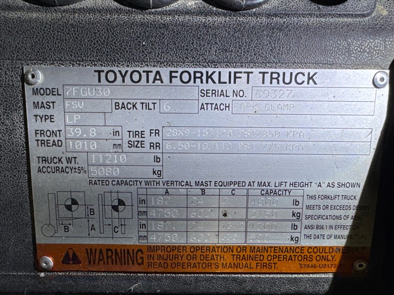 Toyota Fork Lift Truck, mod. 7FGU30, ser. no. 69327, LPG, N/A hrs., 5000 lbs, cap., 175 in. lift height, 3-stage, Cascade side-shift/fork-positioner, cushion tires [Loc. Mat. Hand.]