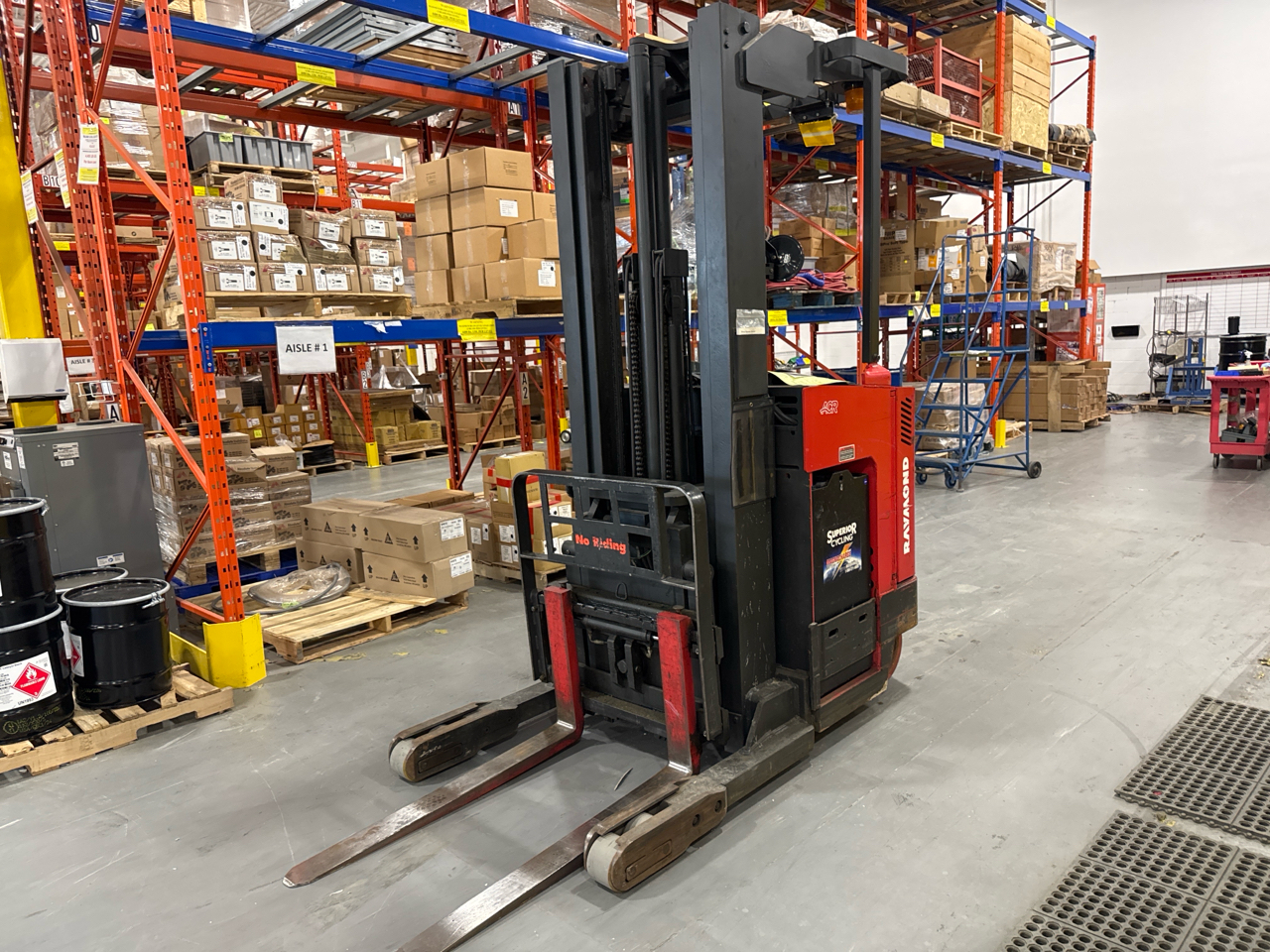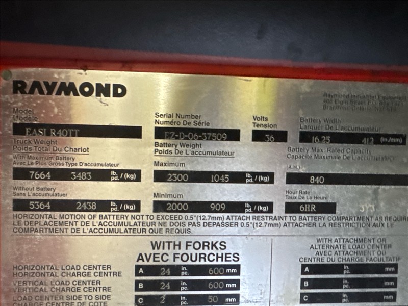 Raymond Reach Truck, mod. EASI R40TT, ser. no. EZ-D-06-57509, 36V, 4000 lbs., 200 in. lift height, 2-stage, integrated scale c/w charger [Loc. Mat. Hand.]