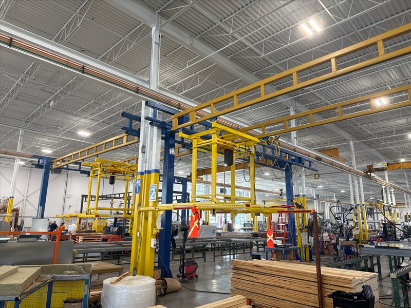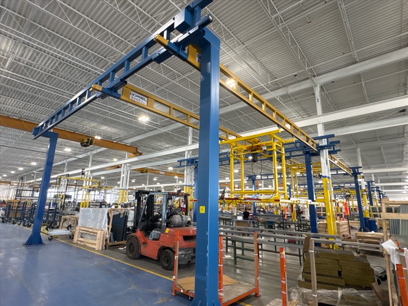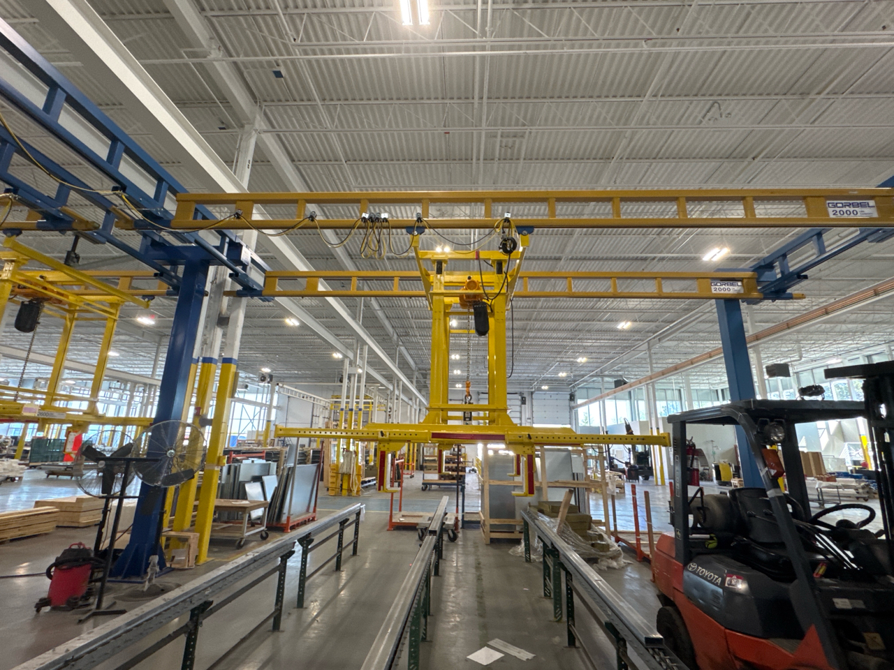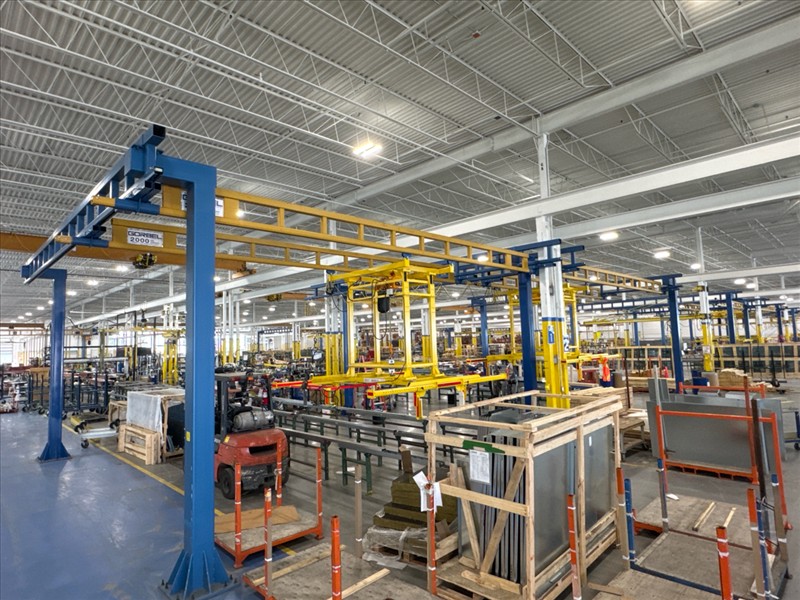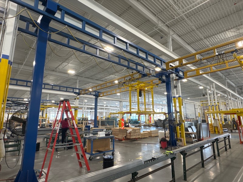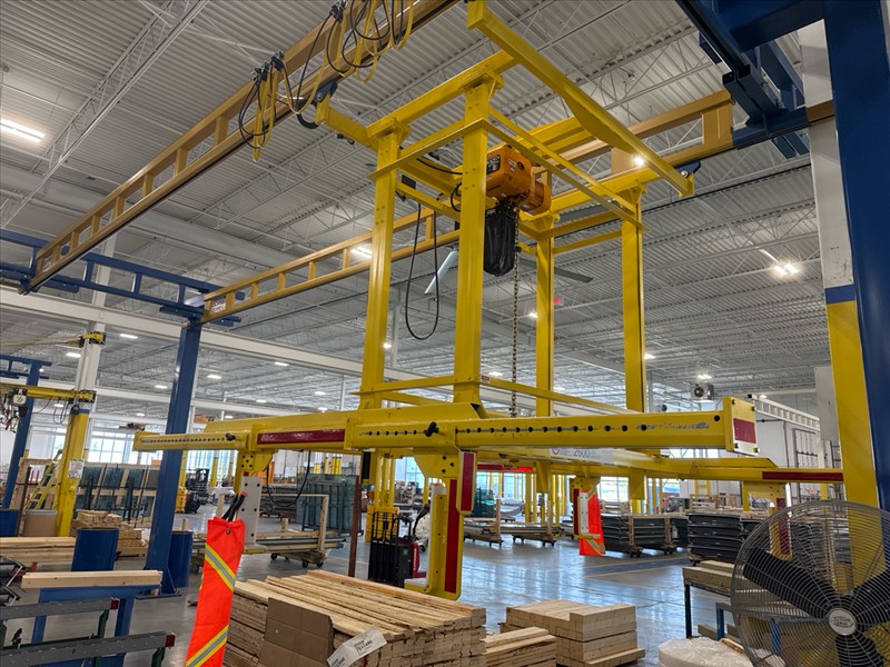 (2) Gorbel Free Standing Hoists, mod. , 4000 lbs. cap., single-girder, 28 ft. span, 30 ft. runway ea. (shared center pillars) w/ (2) Kito 2-ton electric chain hoists, (2) LESG LiftSafe 2600 lbs. window lifting attachments, 9.5 ft. x 12 ft. cap. [Loc. Assembly]