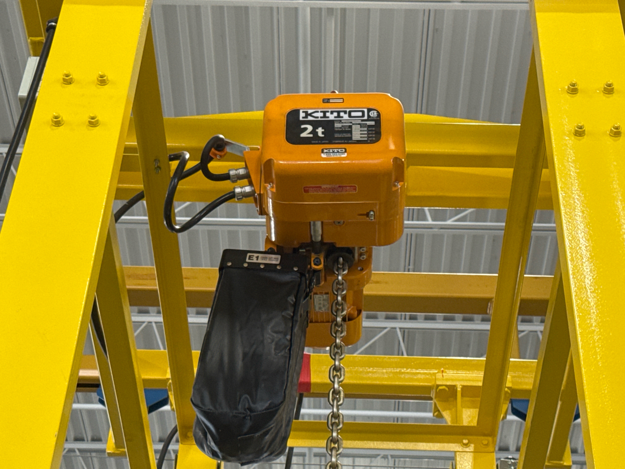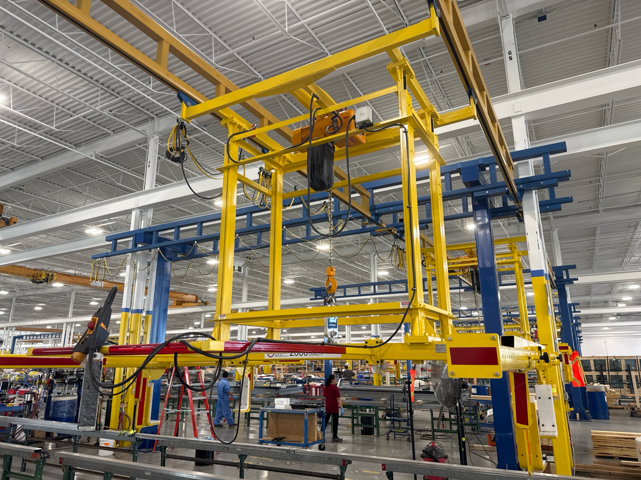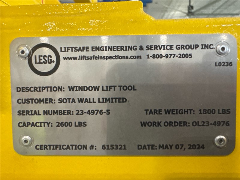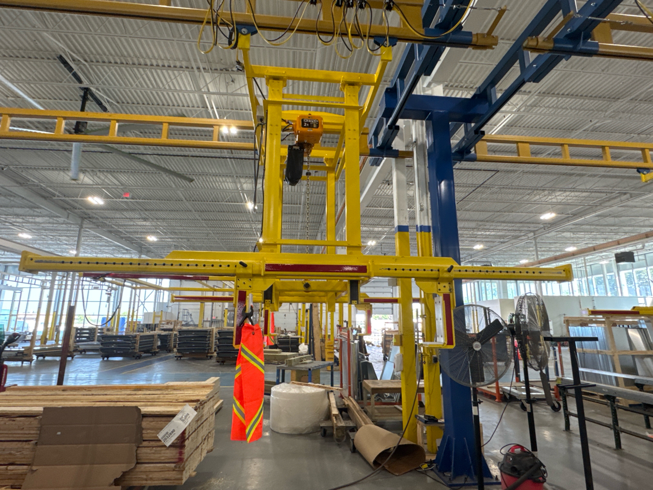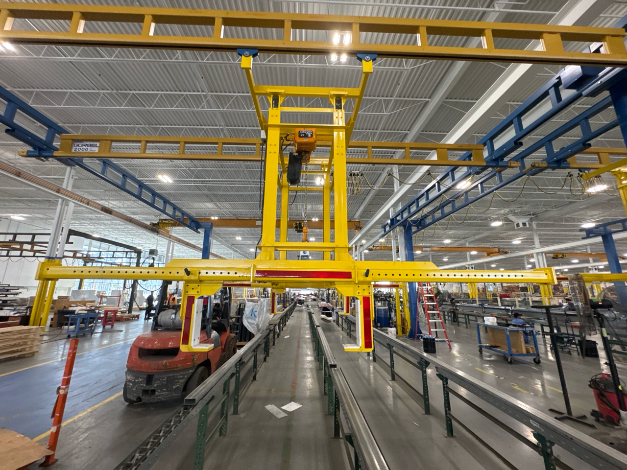 (2) Gorbel Free Standing Hoists, mod. , 4000 lbs. cap., single-girder, 28 ft. span, 30 ft. runway ea. (shared center pillars) w/ (2) Kito 2-ton electric chain hoists, (2) LESG LiftSafe 2600 lbs. window lifting attachments, 9.5 ft. x 12 ft. cap. [Loc. Assembly]