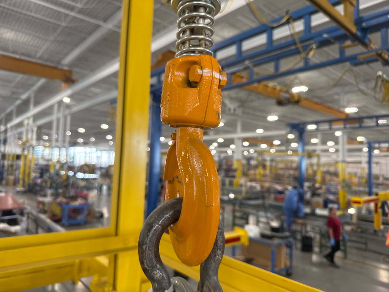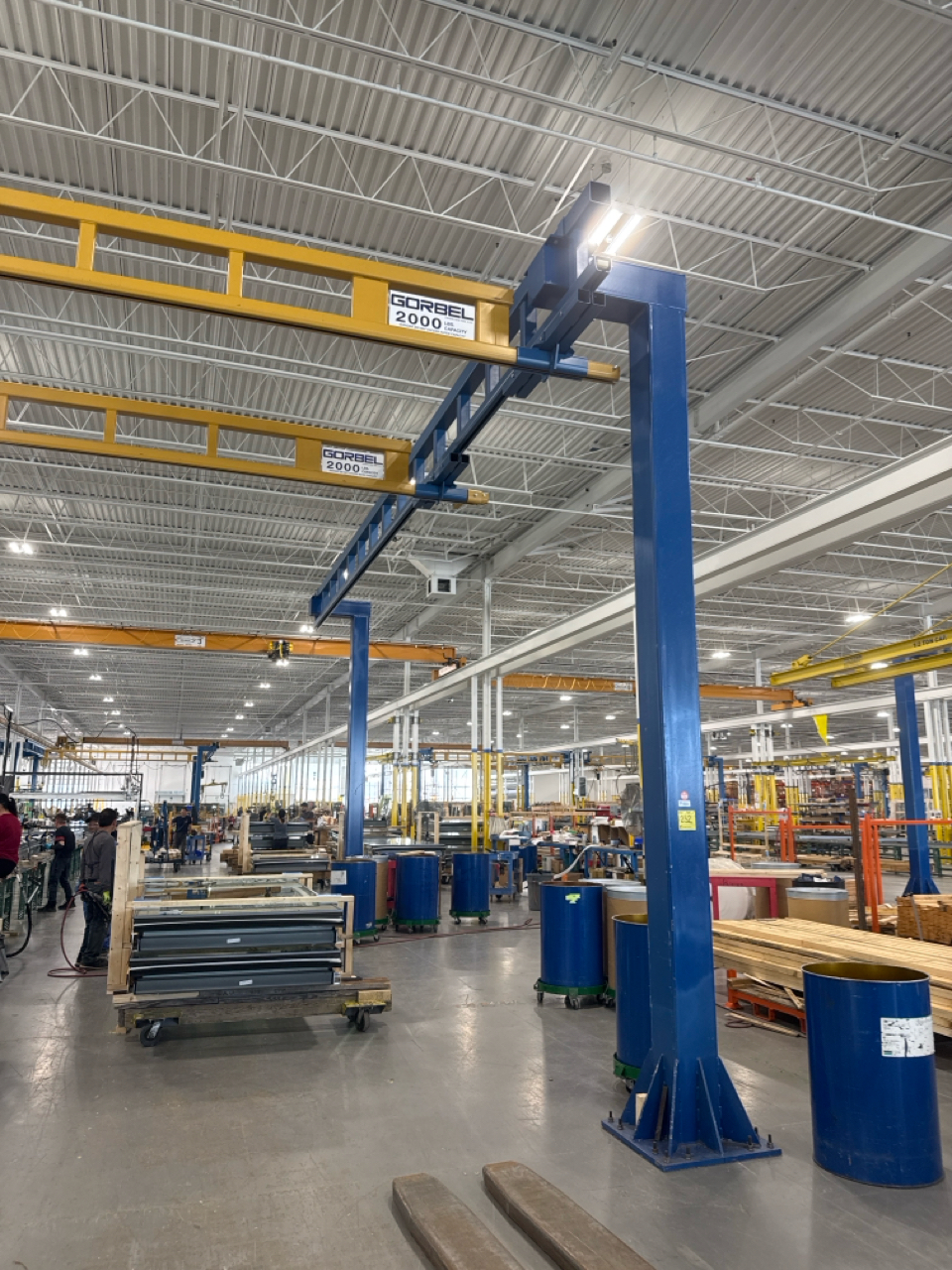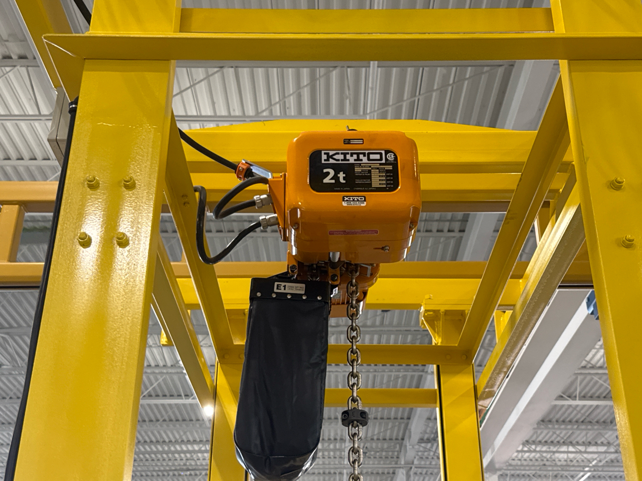 (2) Gorbel Free Standing Hoists, mod. , 4000 lbs. cap., single-girder, 28 ft. span, 30 ft. runway ea. (shared center pillars) w/ (2) Kito 2-ton electric chain hoists, (2) LESG LiftSafe 2600 lbs. window lifting attachments, 9.5 ft. x 12 ft. cap. [Loc. Assembly]