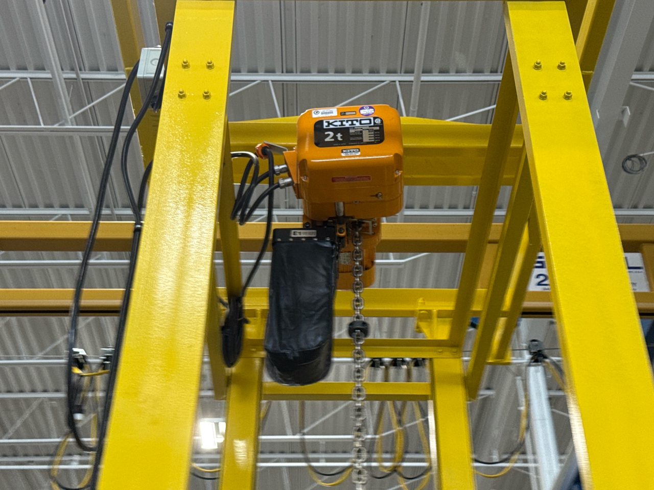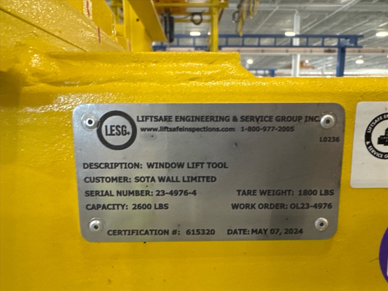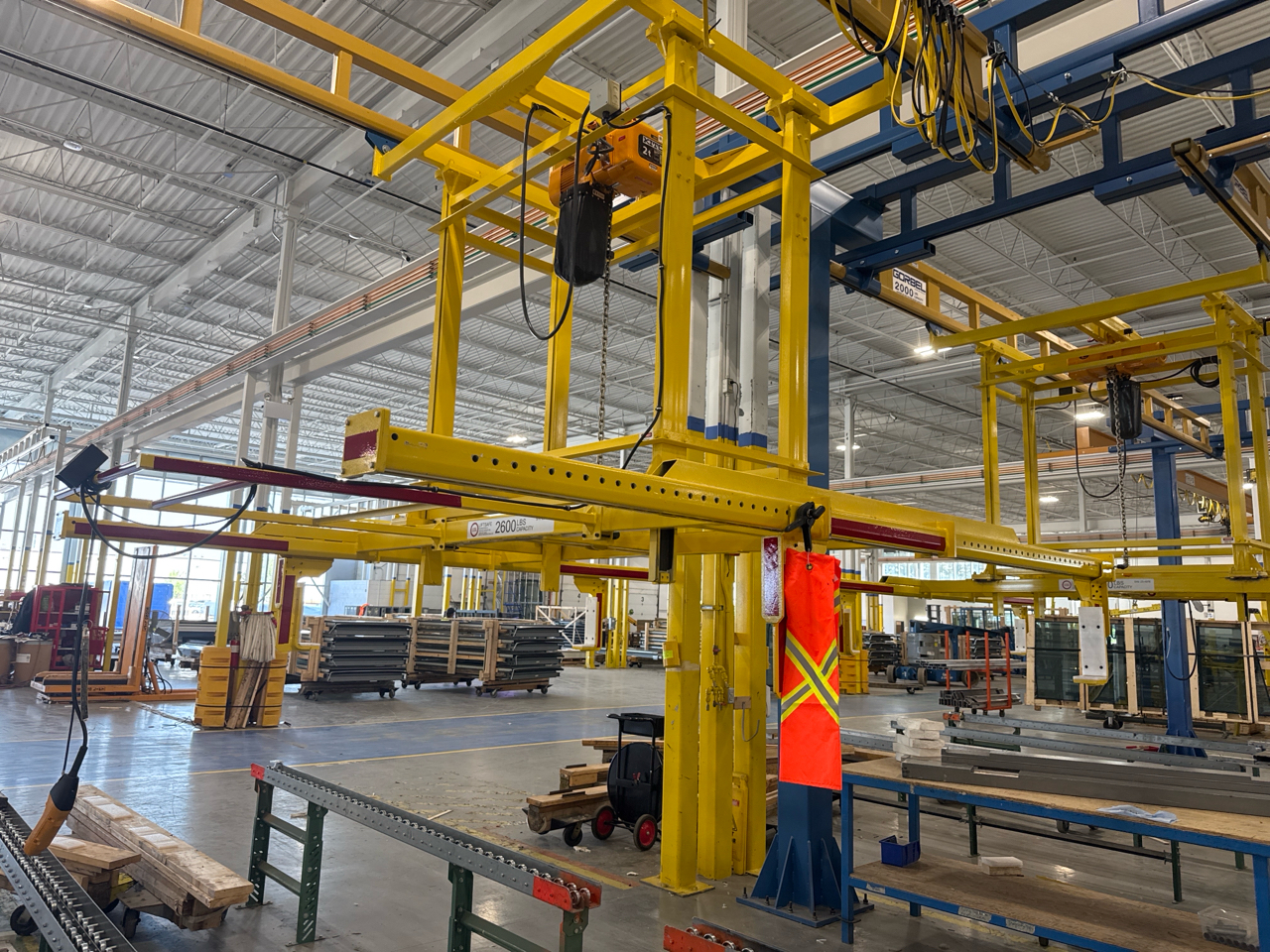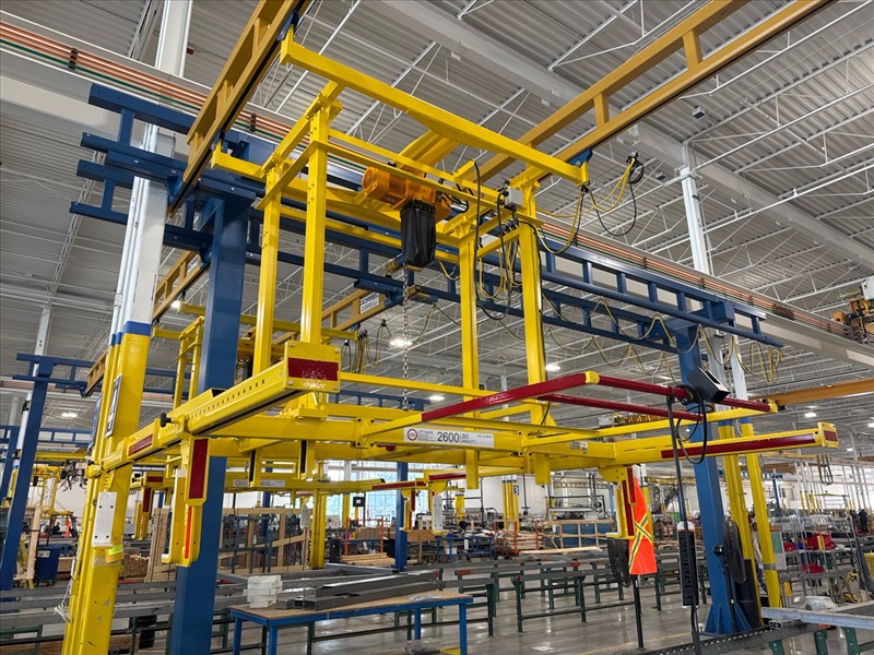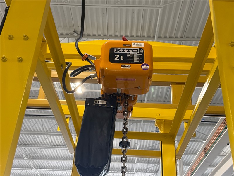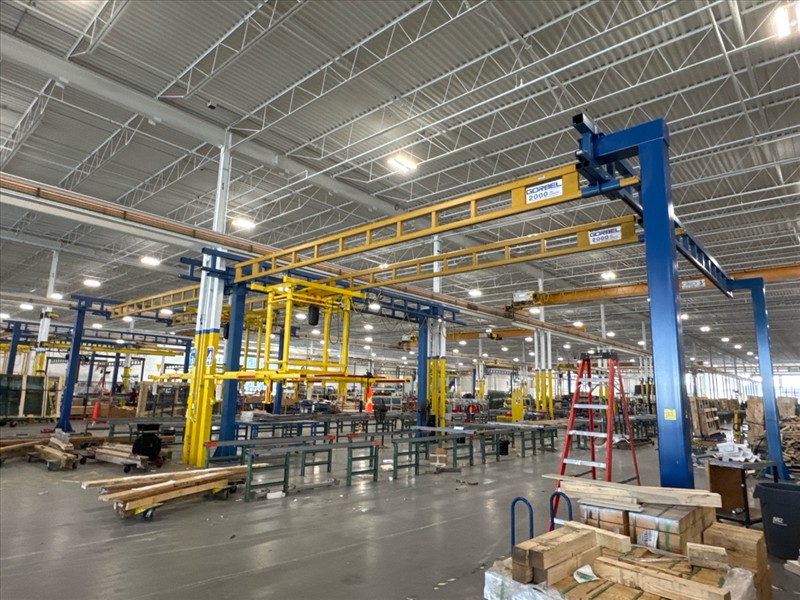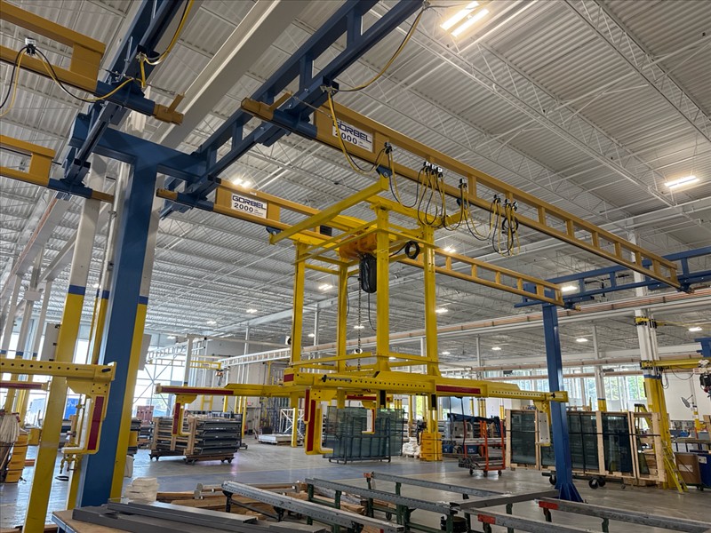 (2) Gorbel Free Standing Hoists, mod. , 4000 lbs. cap., single-girder, 28 ft. span, 30 ft. runway ea. (shared center pillars) w/ (2) Kito 2-ton electric chain hoists, (2) LESG LiftSafe 2600 lbs. window lifting attachments, 9.5 ft. x 12 ft. cap. [Loc. Assembly]