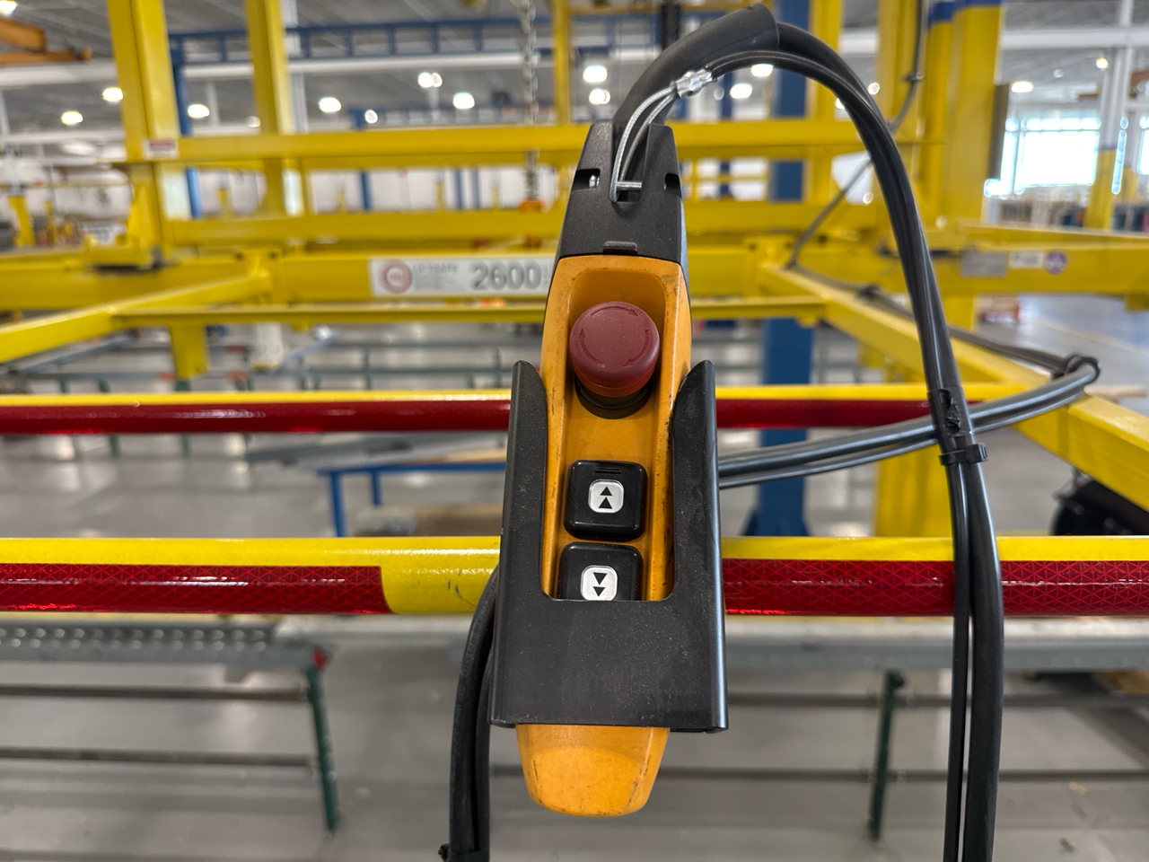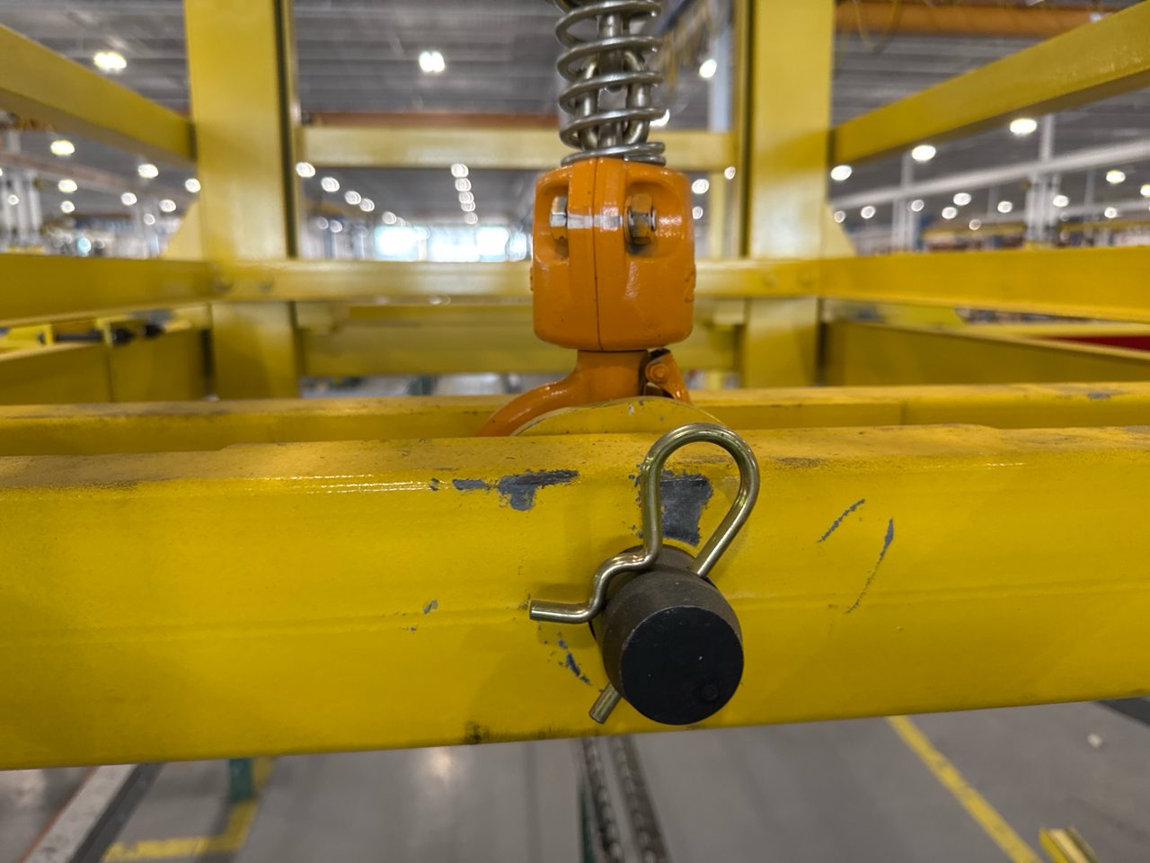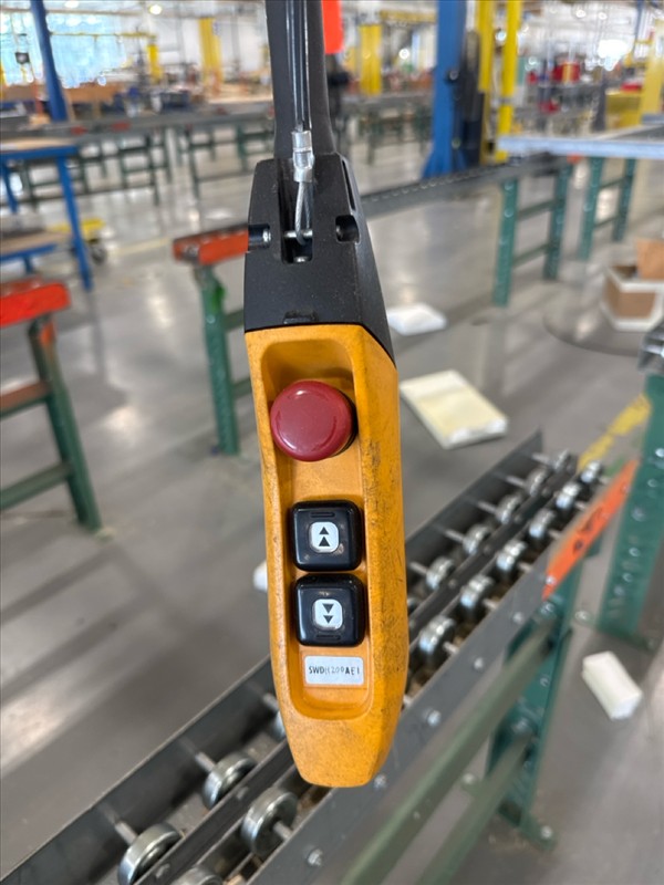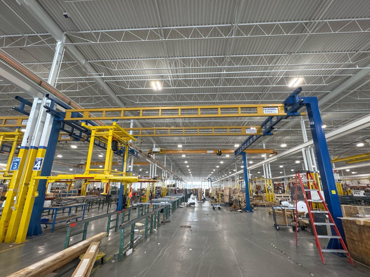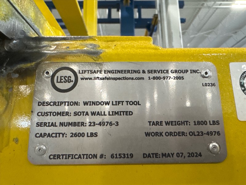 (2) Gorbel Free Standing Hoists, mod. , 4000 lbs. cap., single-girder, 28 ft. span, 30 ft. runway ea. (shared center pillars) w/ (2) Kito 2-ton electric chain hoists, (2) LESG LiftSafe 2600 lbs. window lifting attachments, 9.5 ft. x 12 ft. cap. [Loc. Assembly]