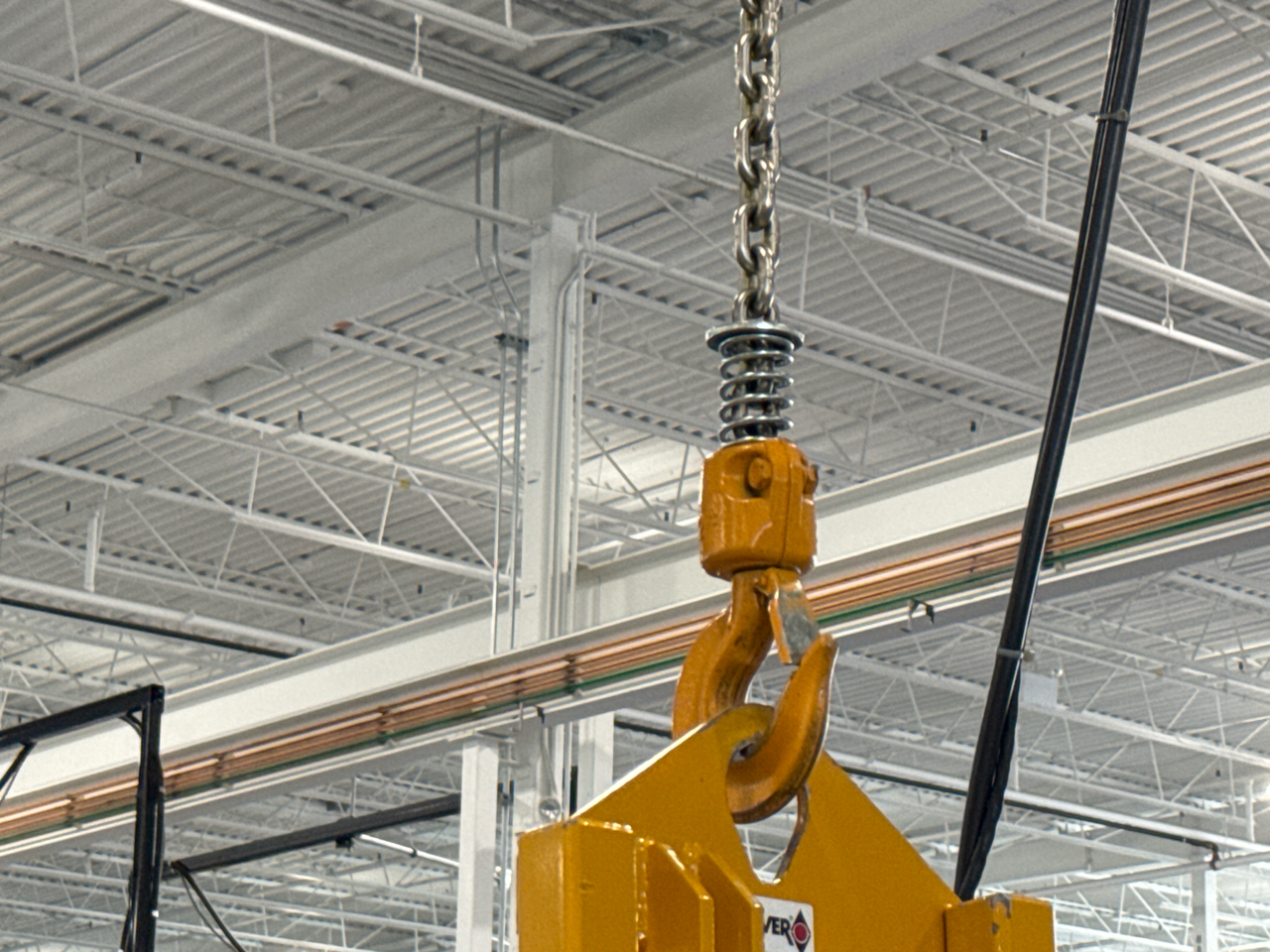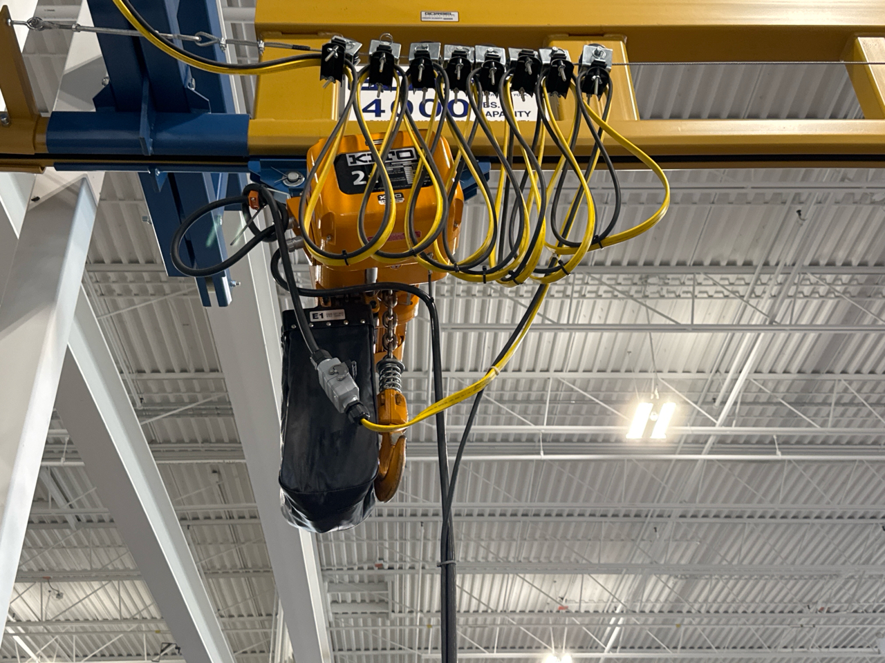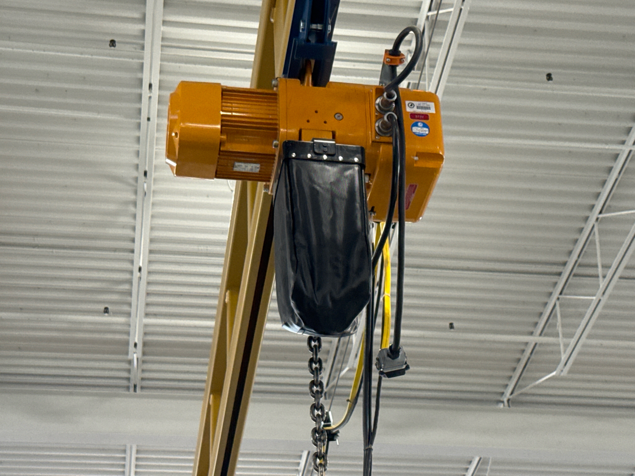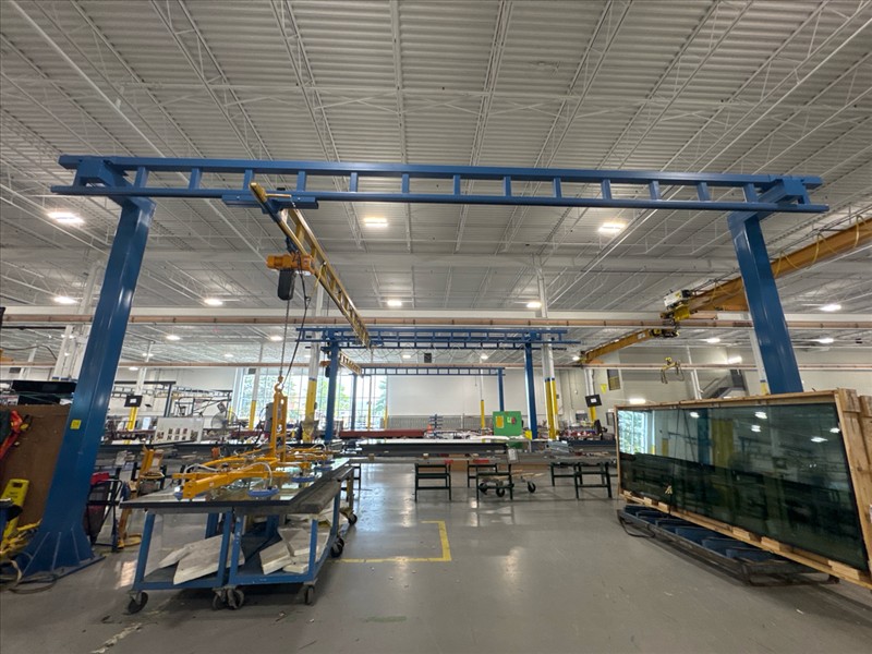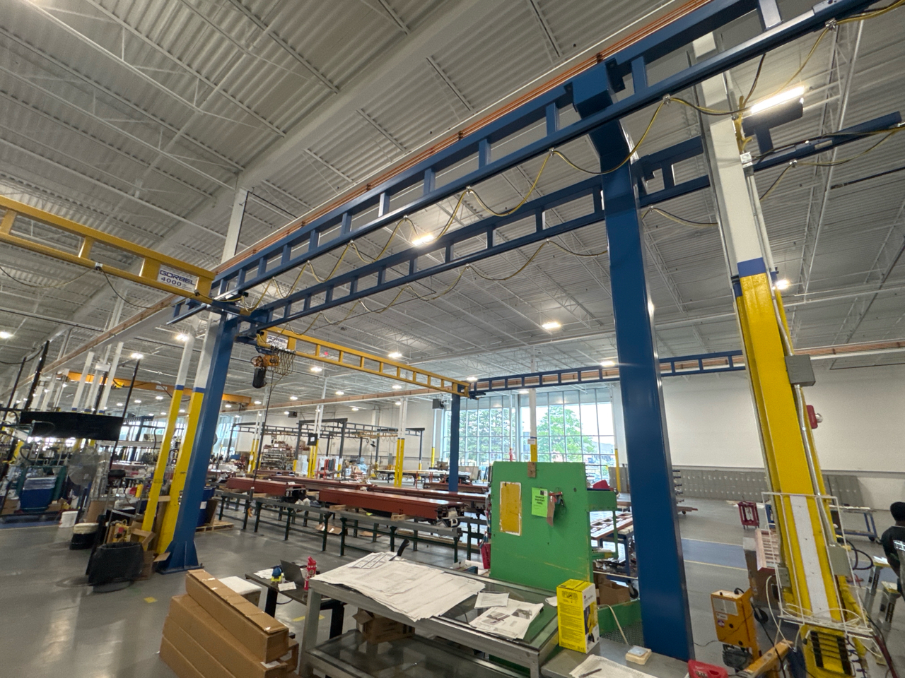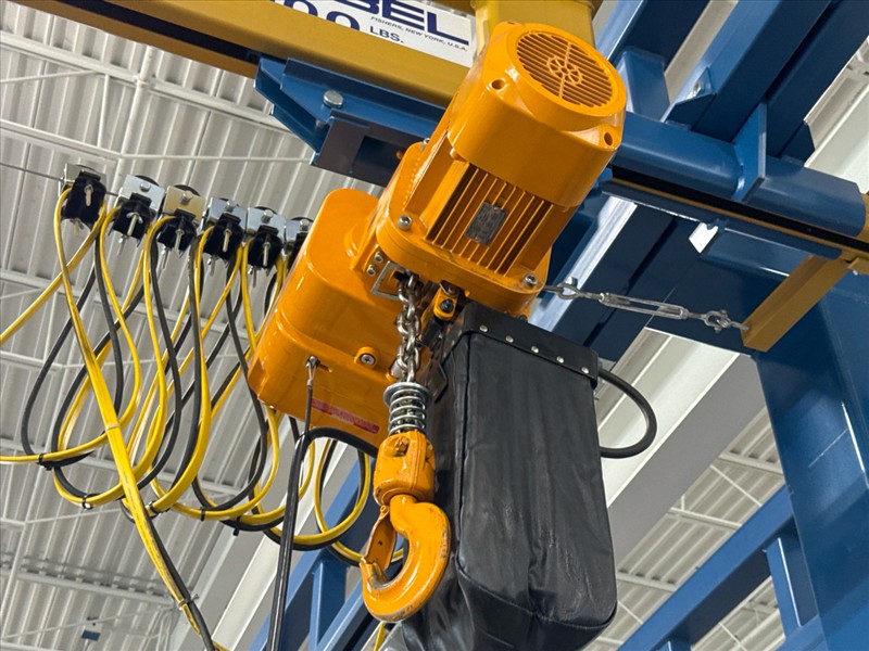 (2) Gorbel Free Standing Hoists, mod. , 4000 lbs. cap., single-girder, 28 ft. span, 30 ft. runway ea. (shared center pillars) w/ (2) Kito 2-ton electric chain hoists [Loc. Assembly]