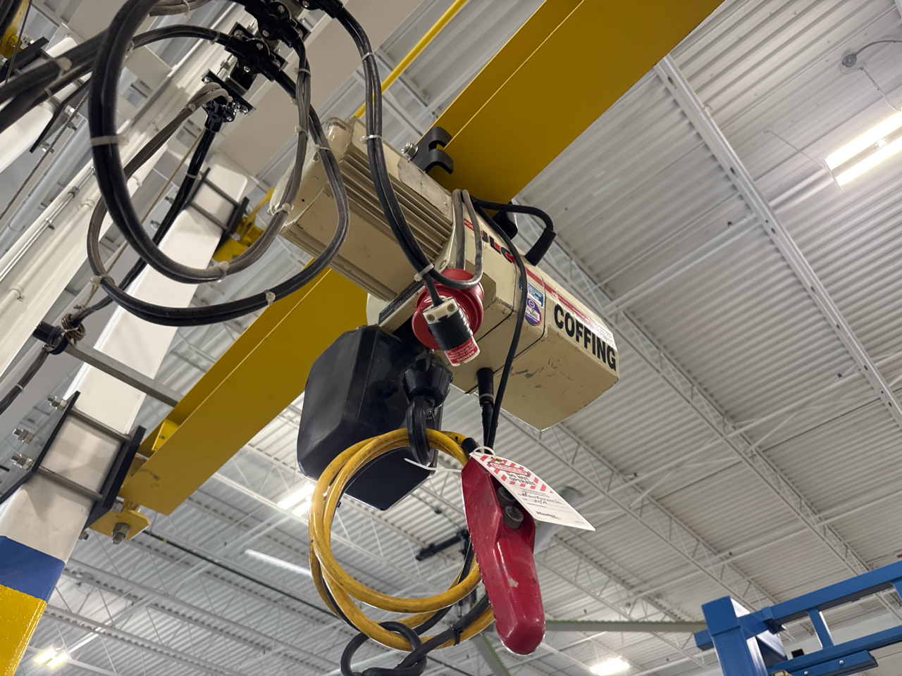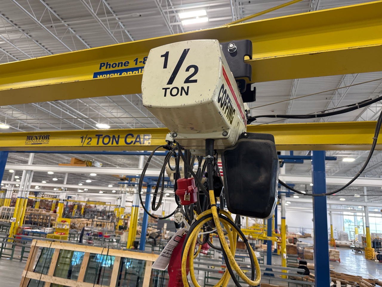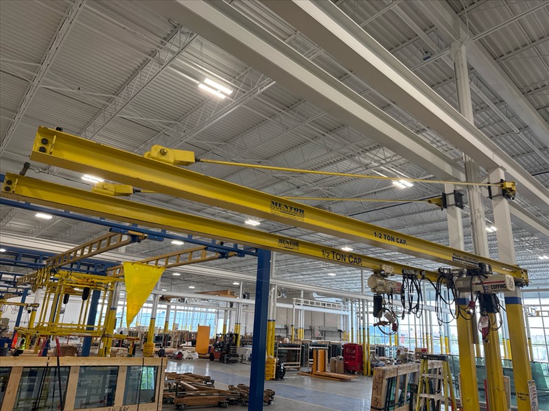 Mentor Dynamics Post-Mounted Jib Crane, mod. , 1/2-ton. cap., 18 ft. span w/ Coffing 1/2-ton electric chain hoist (incl. mounting bracket) [Loc. Assembly]