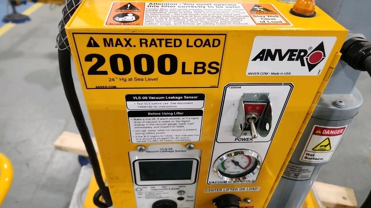 Anver Center-Load Vacuum Lifter, mod. 7200M8-132-4/44, ser. no. SO20009666B (2023), 2000 lbs. cap., 14 ft. max. length, 6 ft. max. width, 3 cm max. thickness c/w vacuum generator and VLS-08 leak sensor [Loc. Assembly]