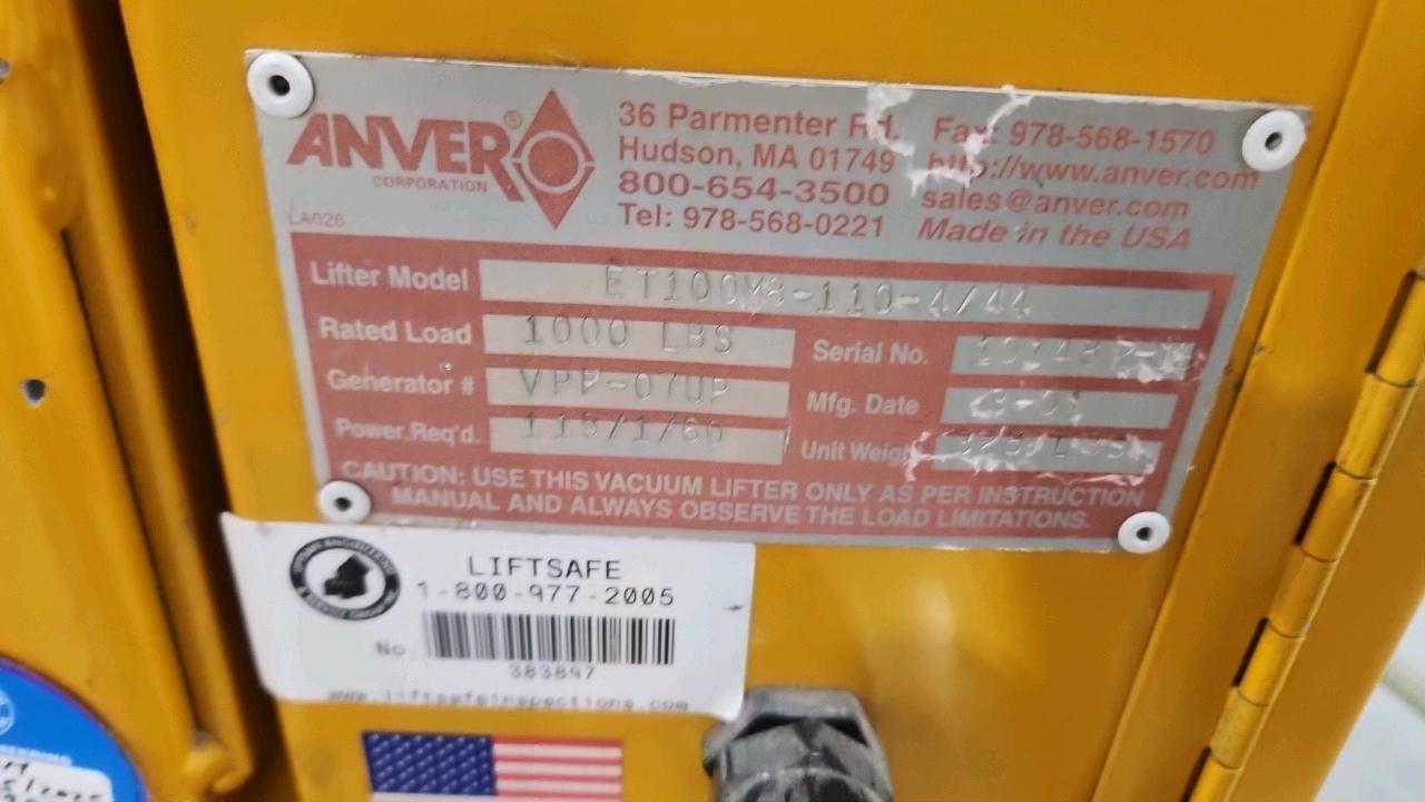 Anver Center-Load Vacuum Lifter, mod. ET1000M8-110-4/44, ser. no. 101482-1B, 1000 lbs. cap., 16 ft. max. length, 6 ft. max. width, 3 cm max. thickness c/w vacuum generator and VLS-08 leak sensor [Loc. Assembly]