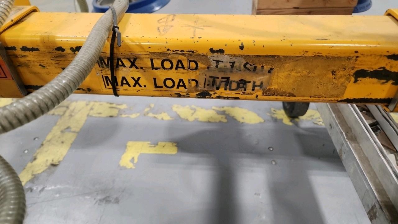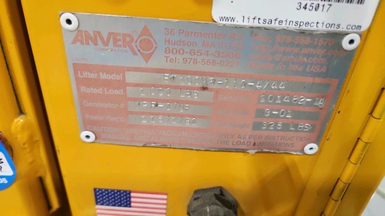 Anver Center-Load Vacuum Lifter, mod. ET1000M8-110-4/44, ser. no. 101482-1A, 1000 lbs. cap., 12 ft. max. length, 8 ft. max. width, 3 cm max. thickness c/w vacuum generator and VLS-08 leak sensor [Loc. Assembly]