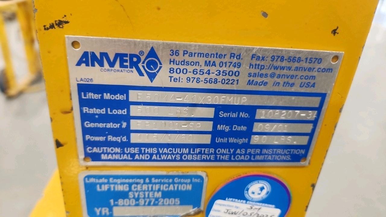Anver Center-Load Vacuum Lifter, mod. E50M4-40x30FMUP, ser. no. 108207-3A, 500 lbs. cap., 6 ft. max. length, 5 ft. max. width, 3 cm max. thickness c/w vacuum generator and VLS-08 leak sensor [Loc. Assembly]