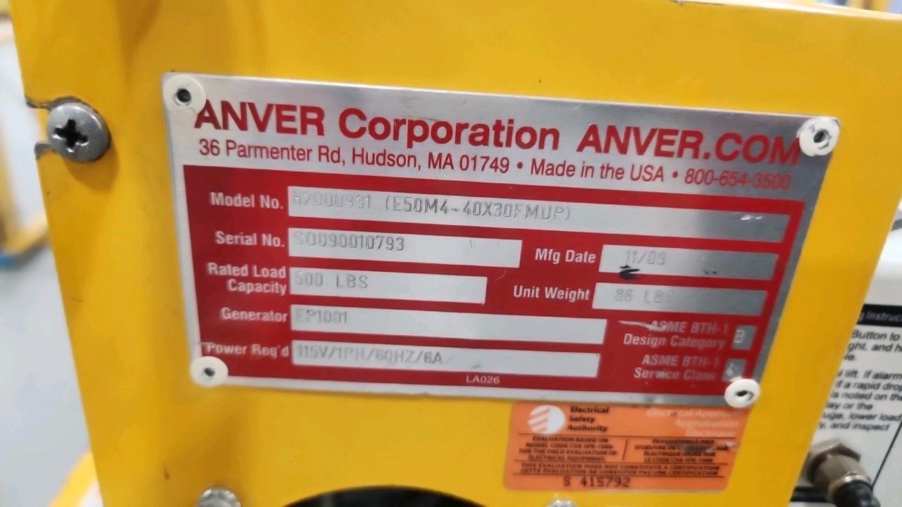 Anver Center-Load Vacuum Lifter, mod. 82000931 (E50M4-40X30FMUP), ser. no. SO090010793, 500 lbs. cap. [Loc. Assembly]
