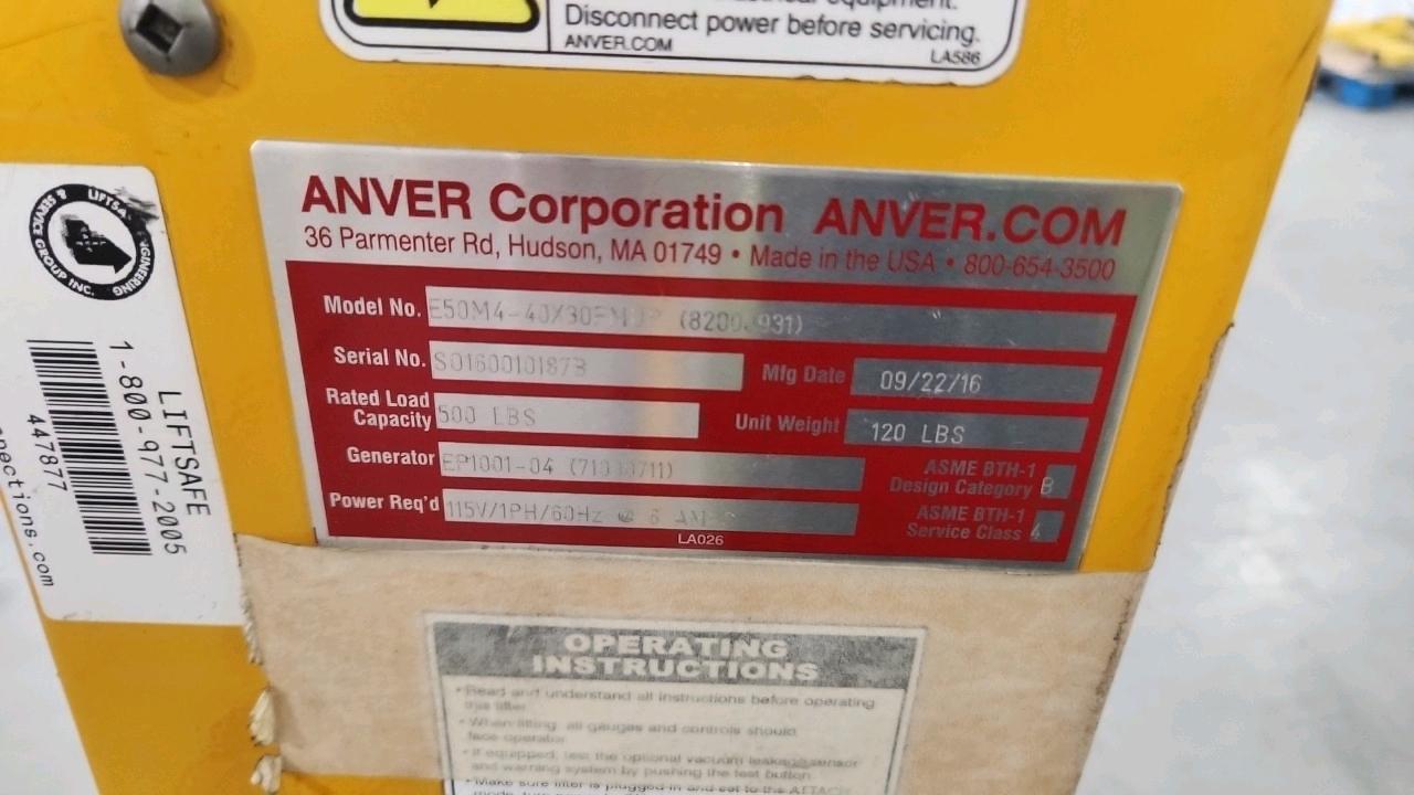 Anver Center-Load Vacuum Lifter, mod. E50M4-40X30FMUP (82000931), ser. no. S01600101873, 500 lbs. cap. [Loc. Assembly]
