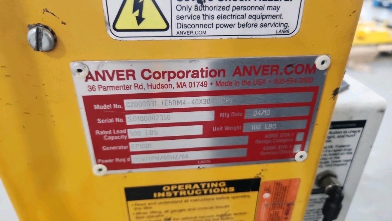 Anver Center-Load Vacuum Lifter, mod. E50M4-40X30FMUP (82000931), ser. no. S0100002356, 500 lbs. cap. [Loc. Assembly]