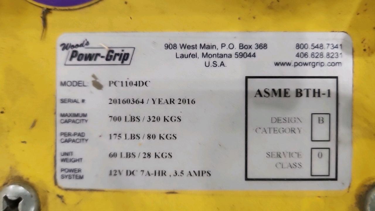 Wood's Pwr-Grip Center-Load Vacuum Lifter, mod. PC1104DC, ser. no. 20160364 (2016), 700 lbs. cap. [Loc. Assembly]