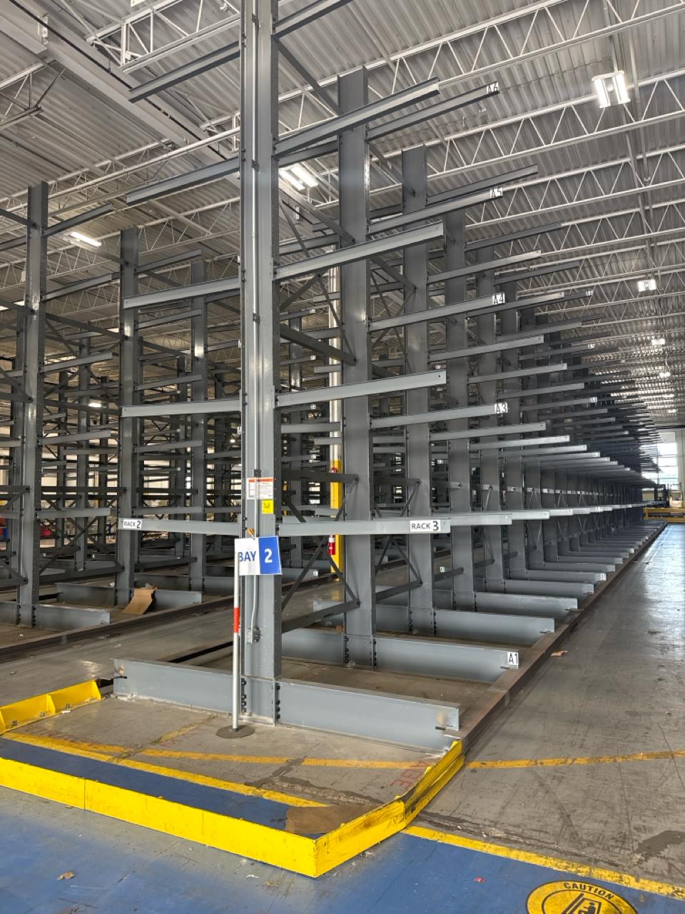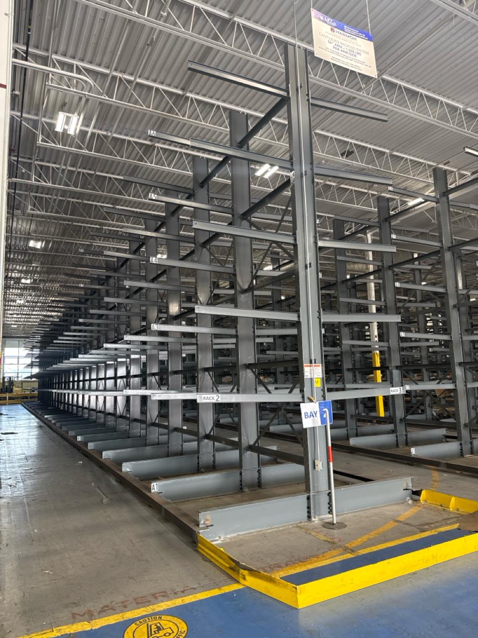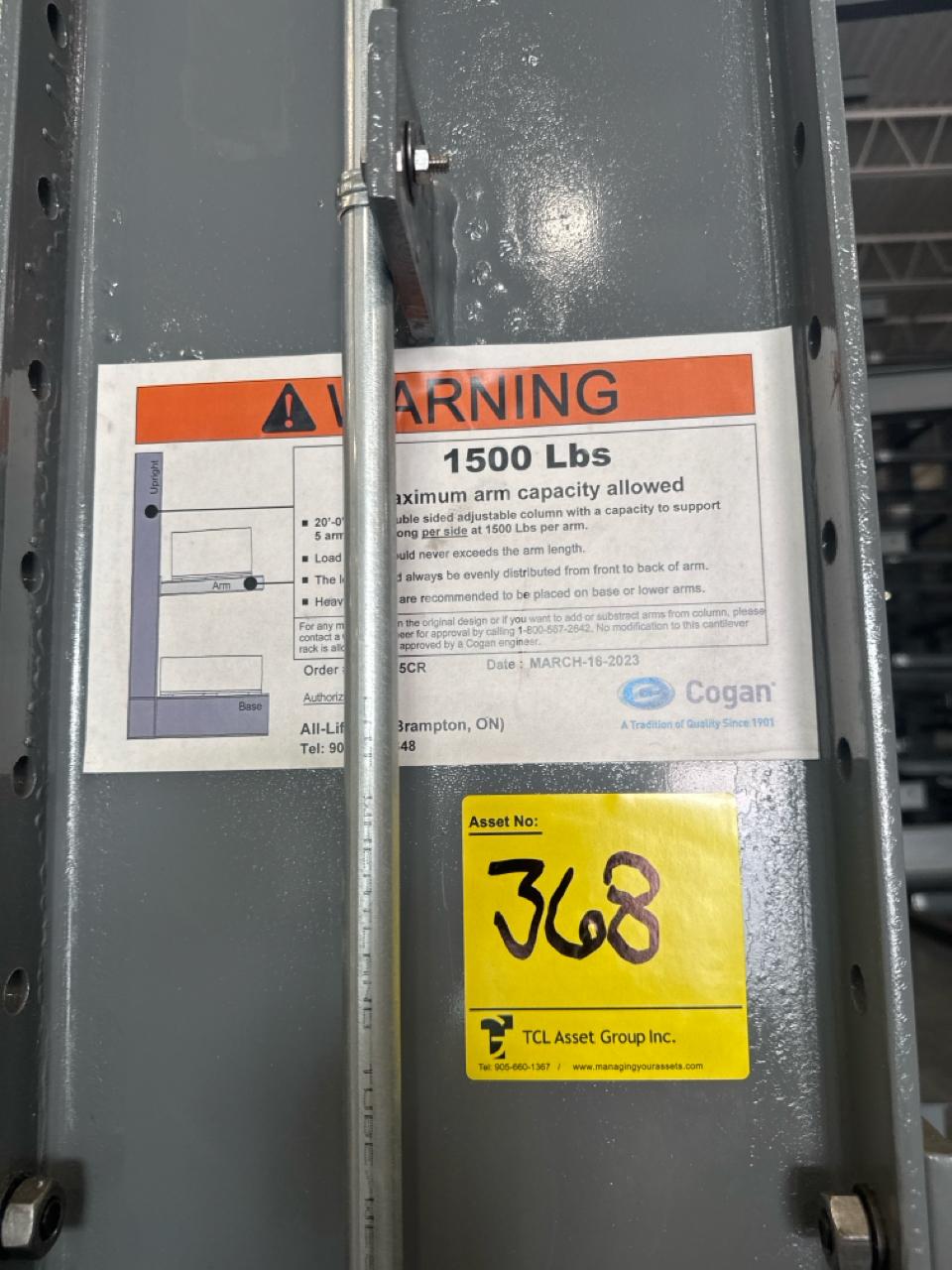 (27 uprights and 270 arms) All-Lift/Cogan cantilever racking, double sided, 20 ft. high w/ 54 in. adjustable arms, 1500 lbs. cap. ea. [Loc. Fabrication]