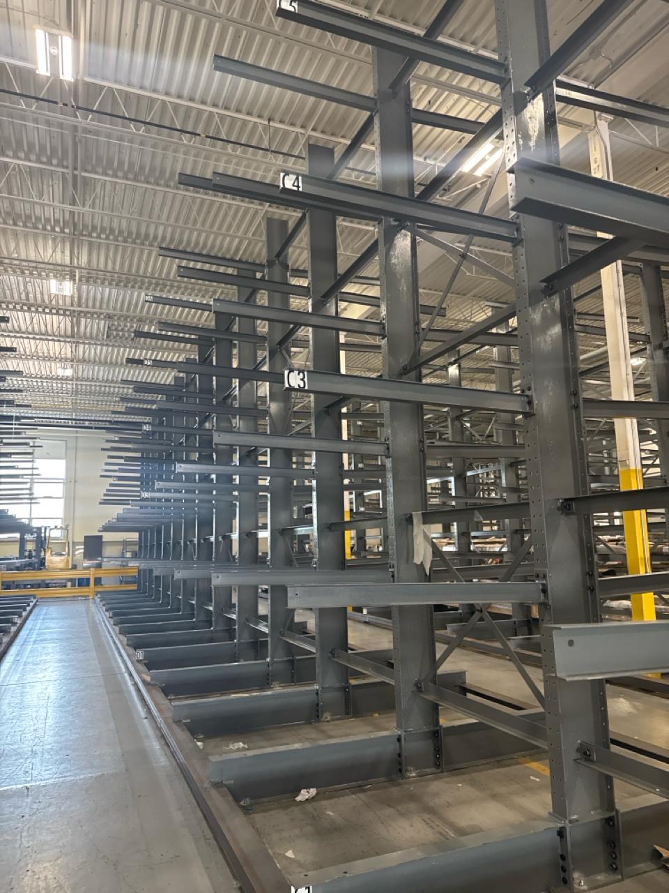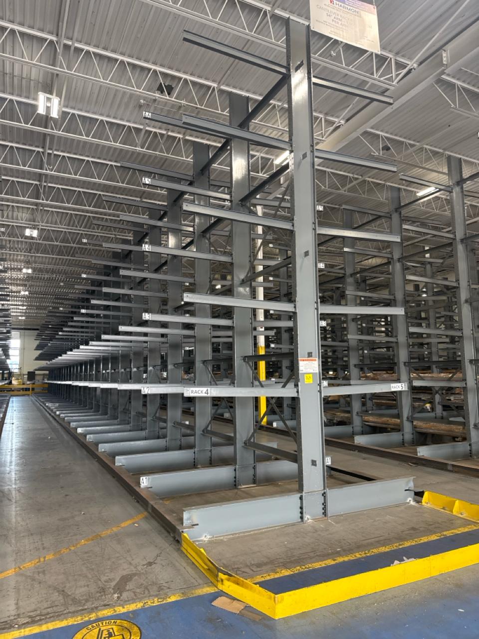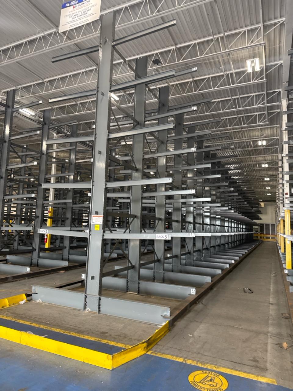 (27 uprights and 270 arms) All-Lift/Cogan cantilever racking, double sided, 20 ft. high w/ 54 in. adjustable arms, 1500 lbs. cap. ea. [Loc. Fabrication]
