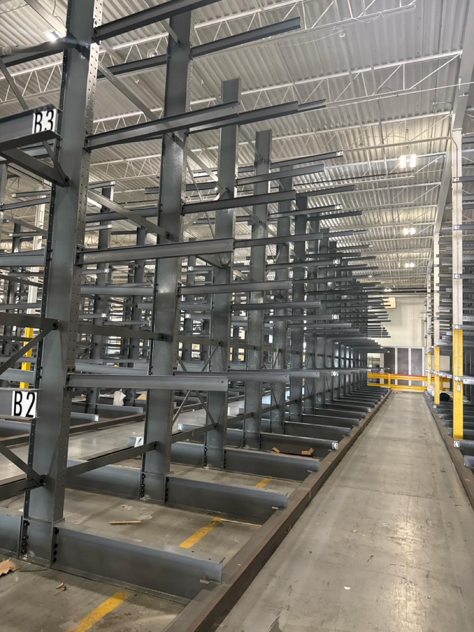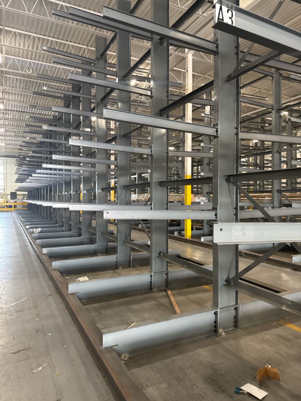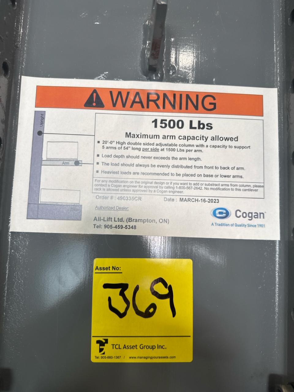 (27 uprights and 270 arms) All-Lift/Cogan cantilever racking, double sided, 20 ft. high w/ 54 in. adjustable arms, 1500 lbs. cap. ea. [Loc. Fabrication]