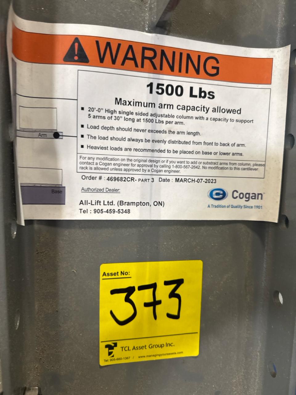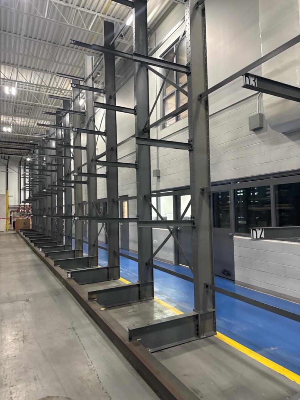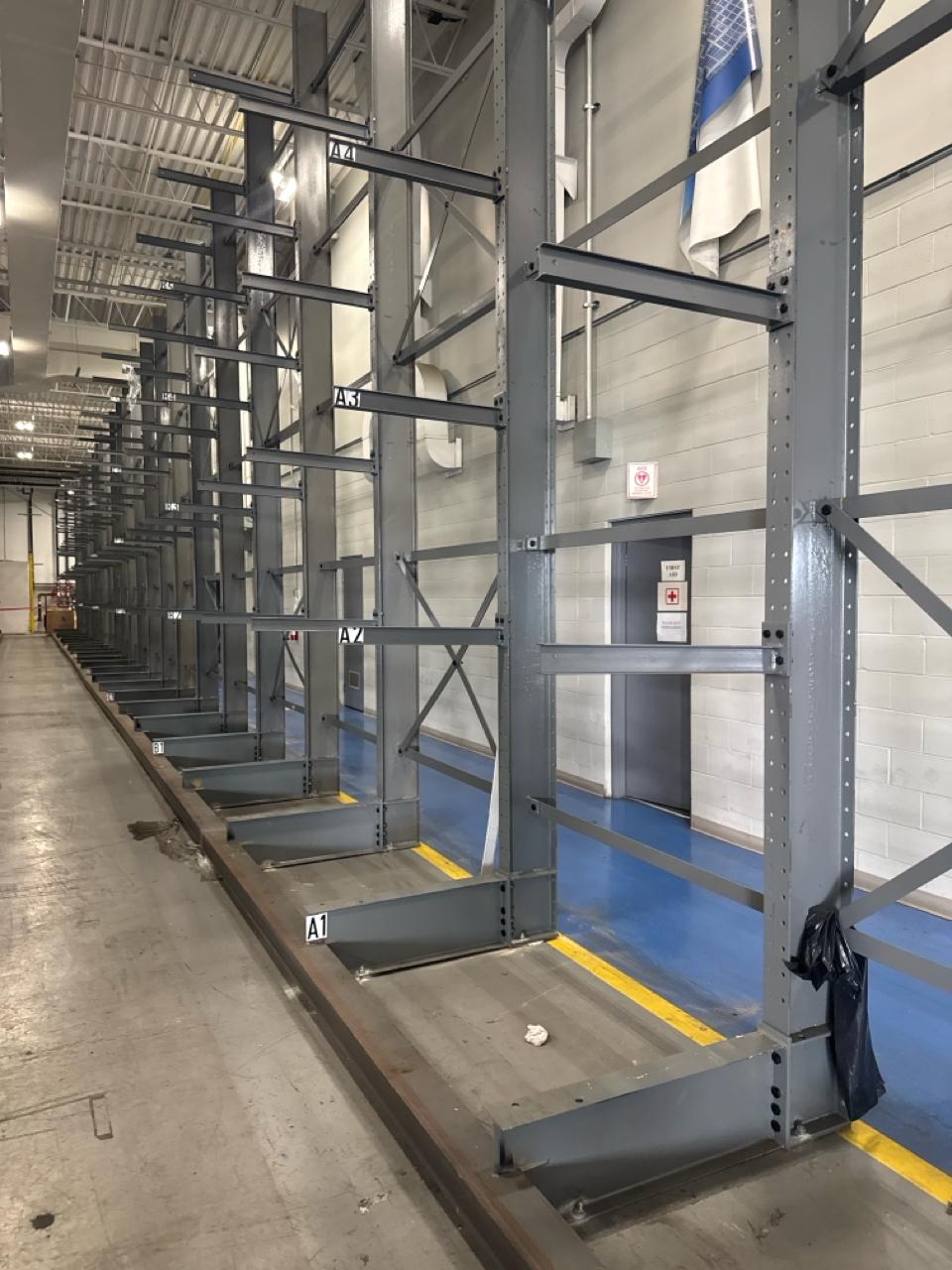 (27 uprights and 135 arms) All-Lift/Cogan cantilever racking, single sided, 20 ft. high w/ 30 in. adjustable arms, 1500 lbs. cap. ea. [Loc. Fabrication]