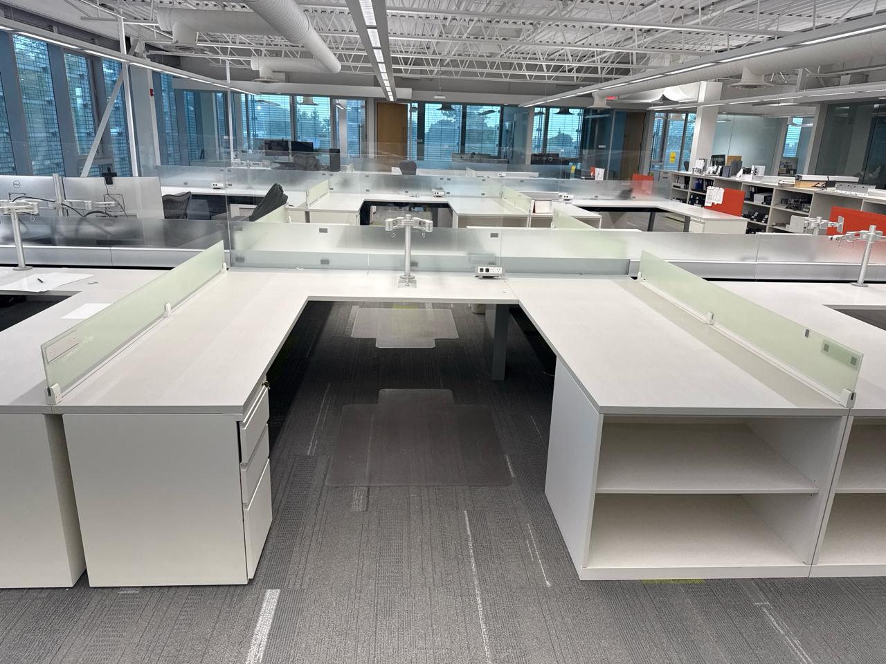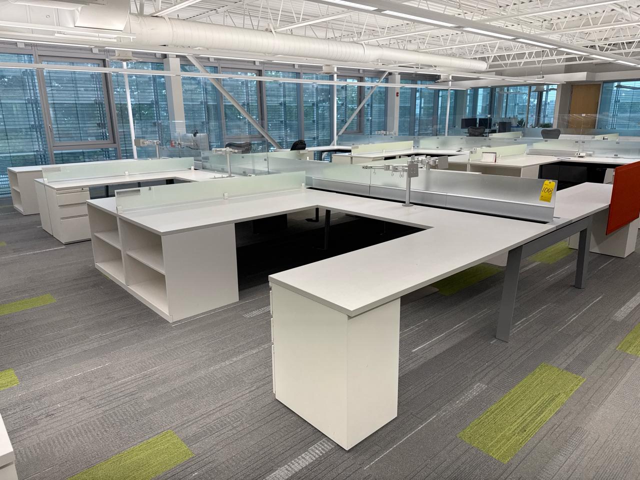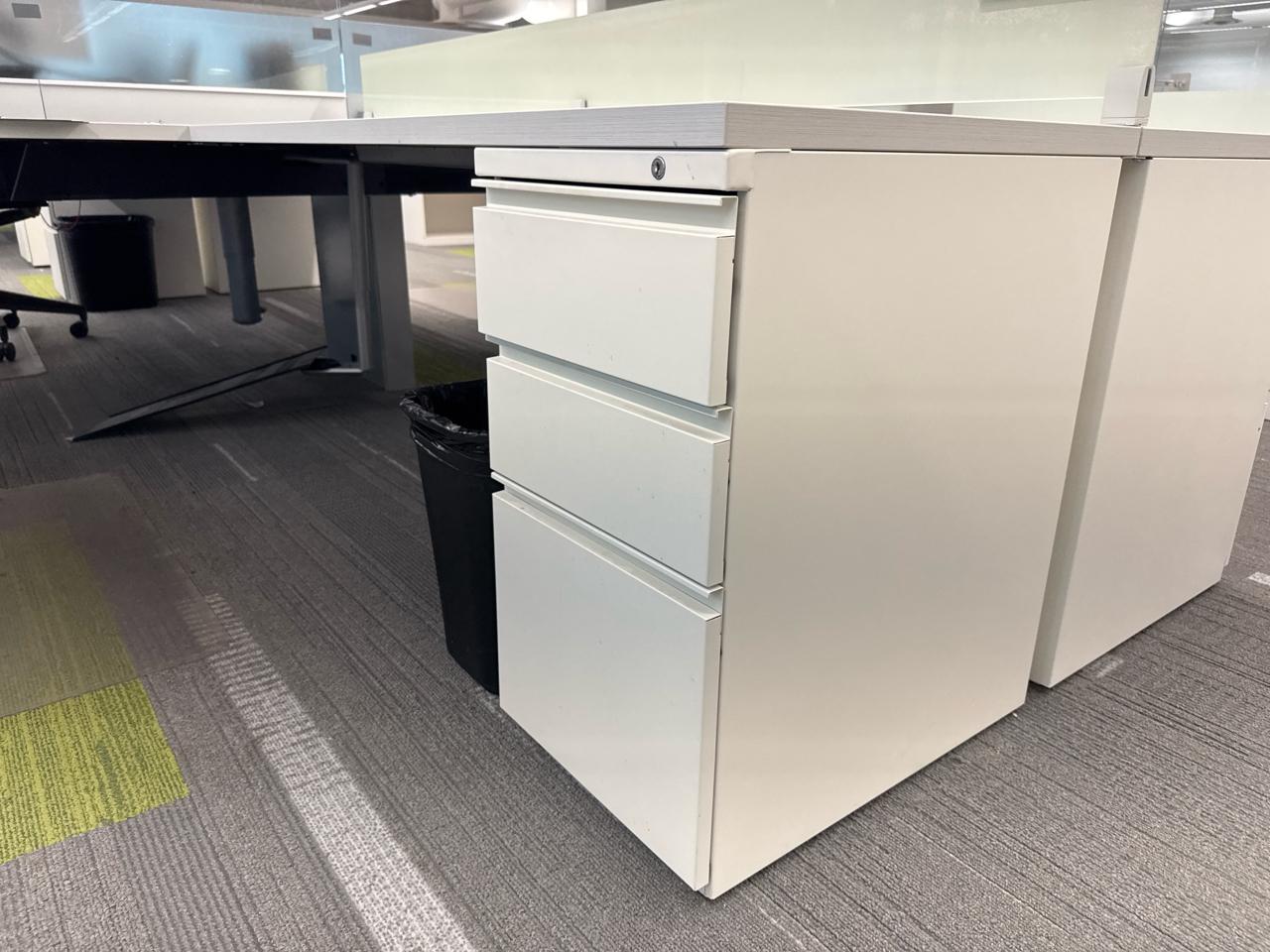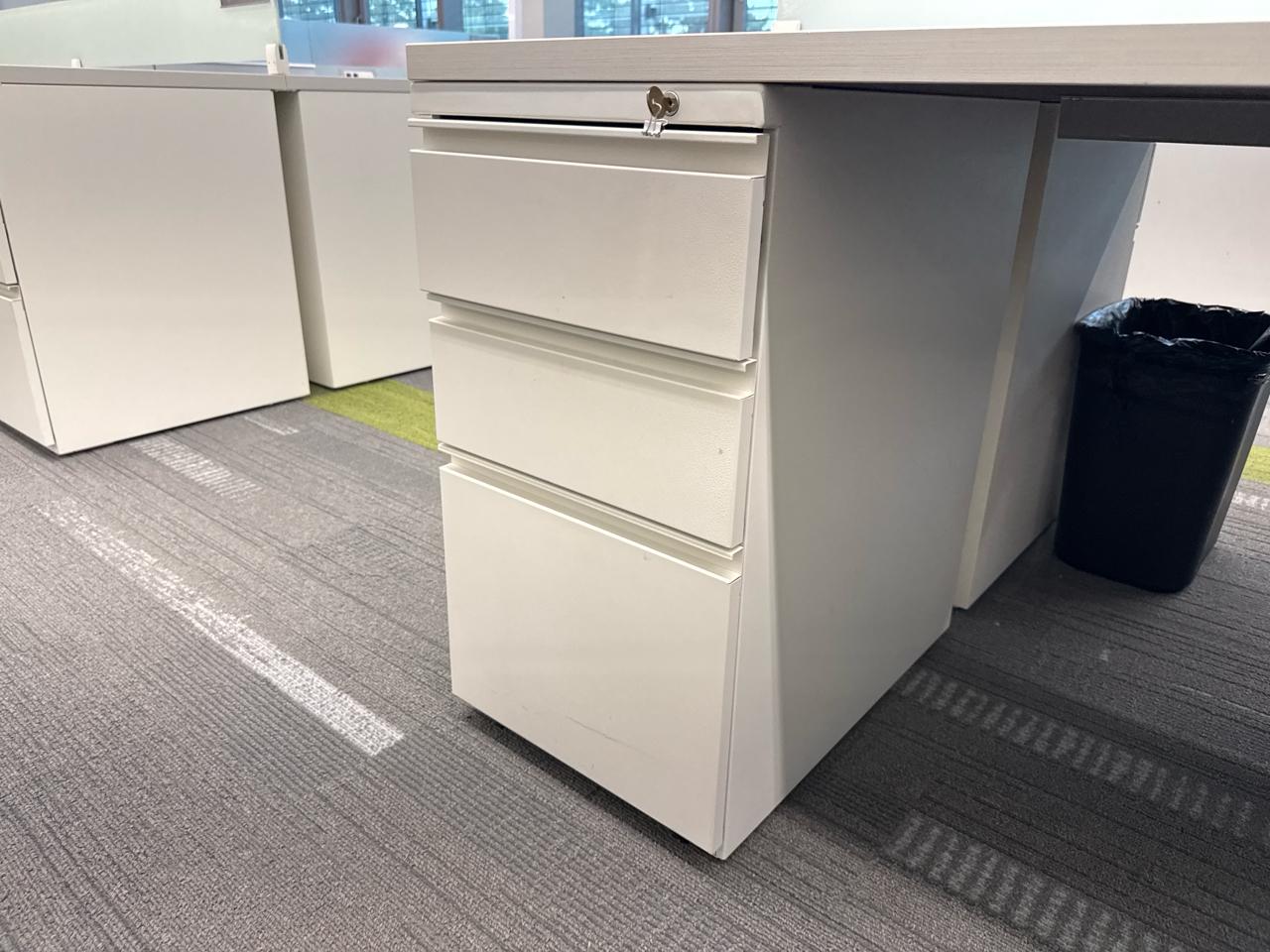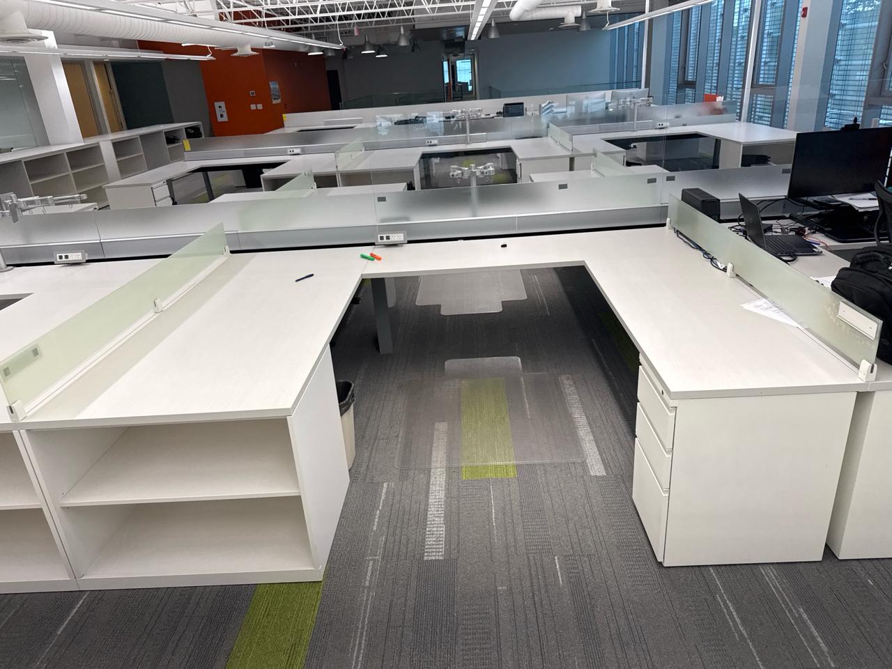 Office furniture, 6 sectional Office cubical, 223 inch length x 8ft width x 29 inch height. Per cubical is 111.5 inch by length. C/W 3 door filing cabinet. Contents not included [2nd Floor Office]