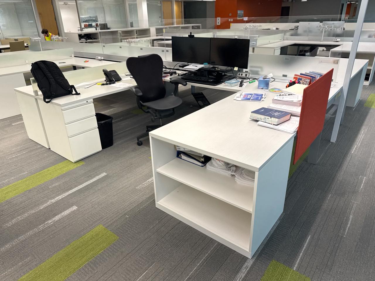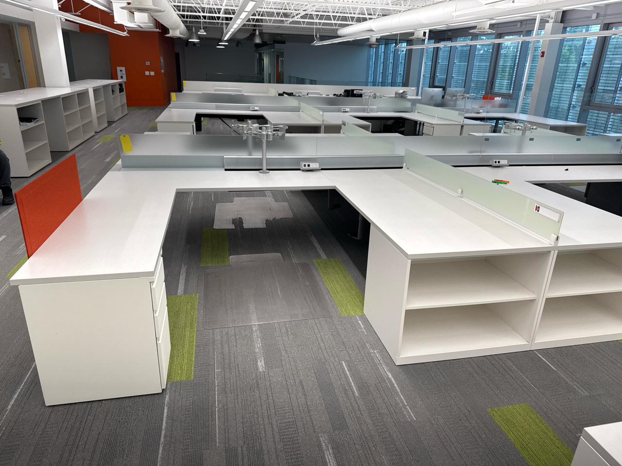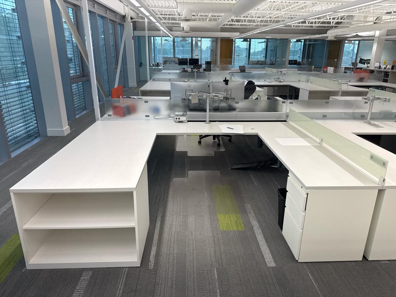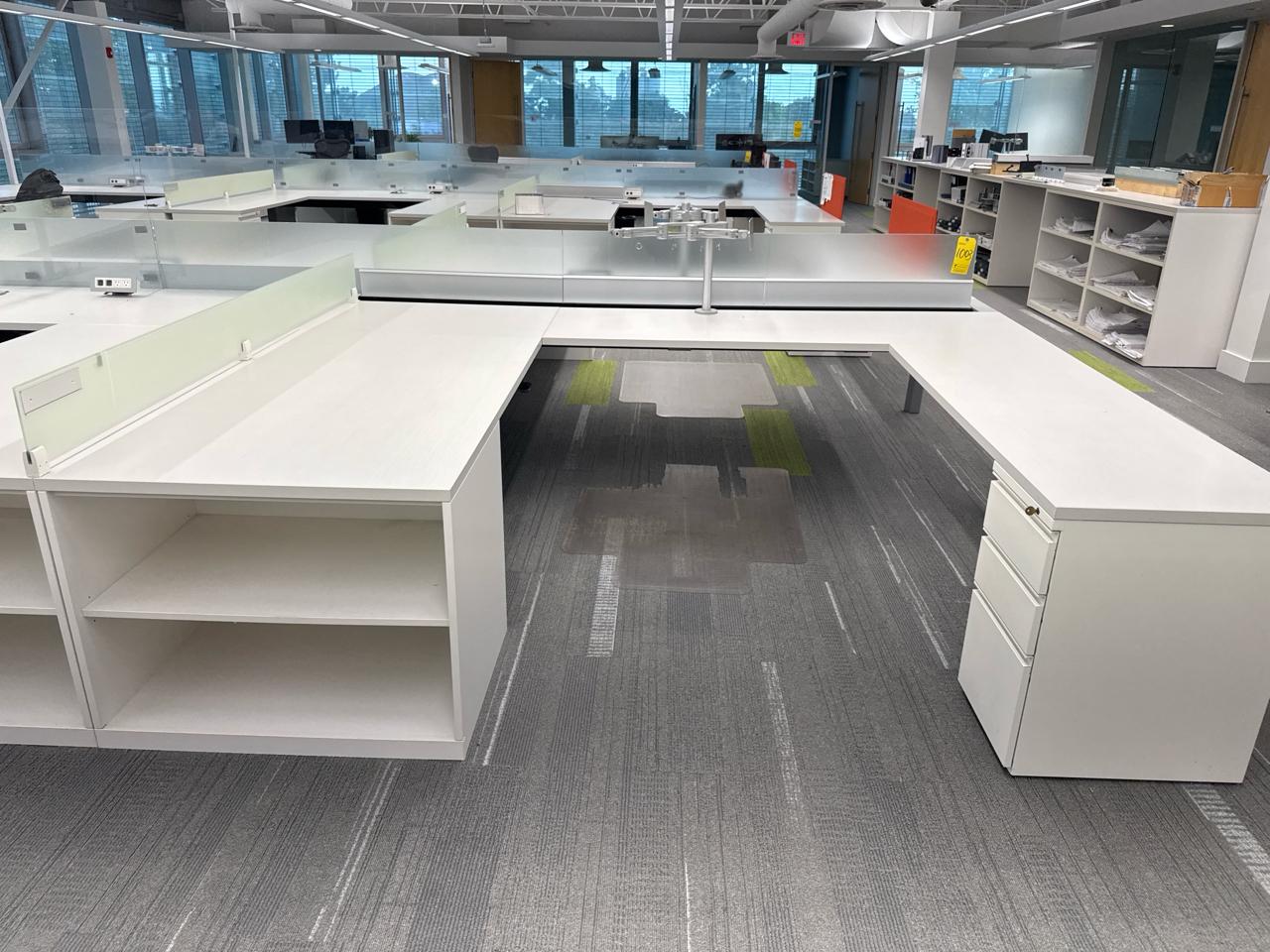 Office furniture, 6 sectional Office cubical, 223 inch length x 8ft width x 29 inch height. Per cubical is 111.5 inch by length. C/W 3 door filing cabinet. Contents not included [2nd Floor Office]