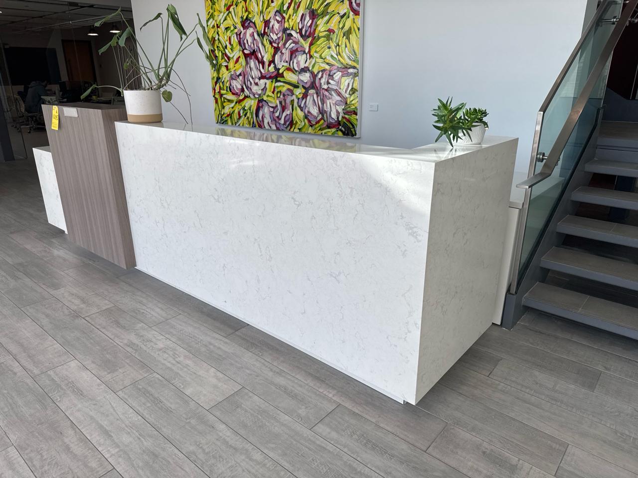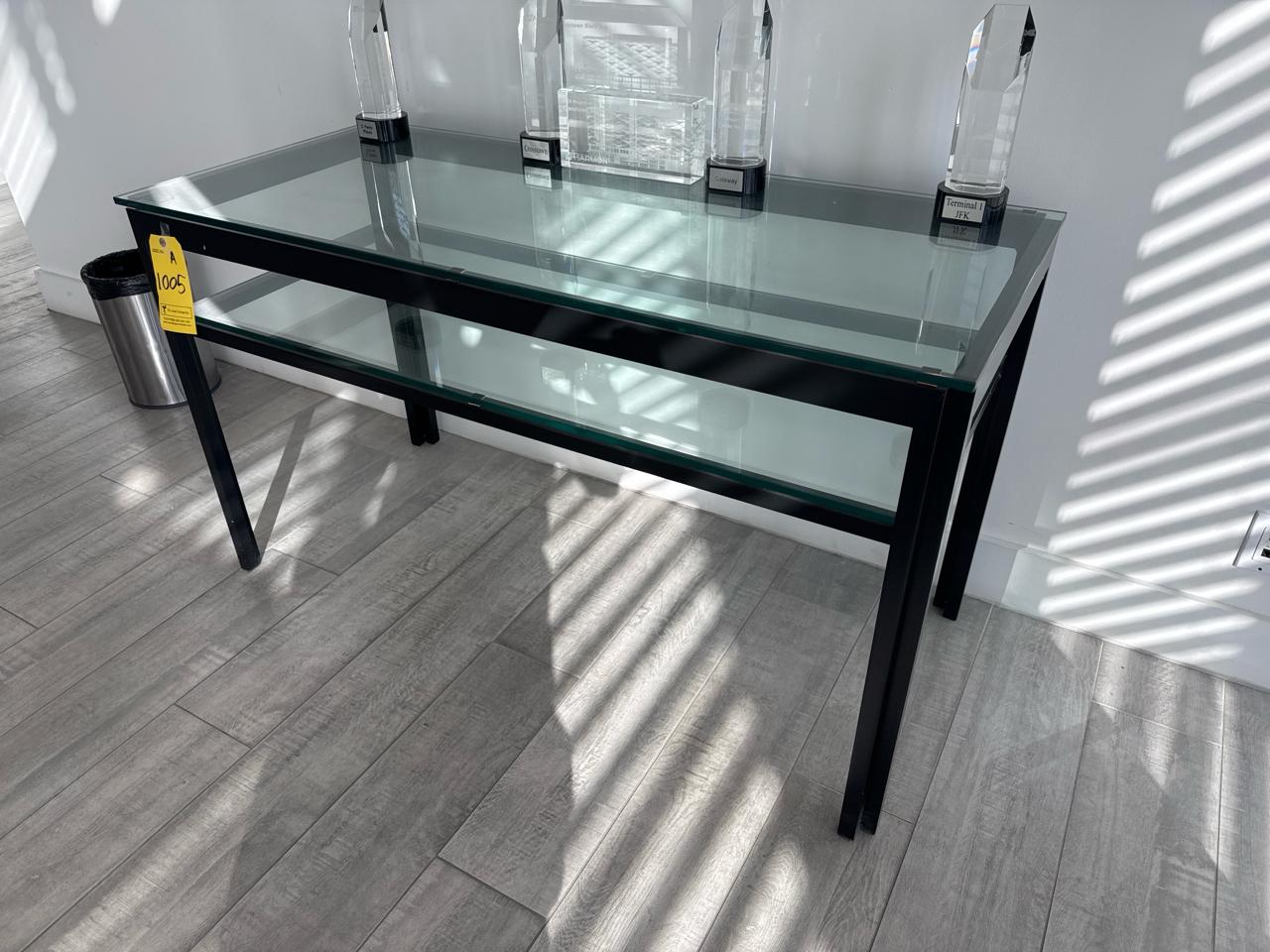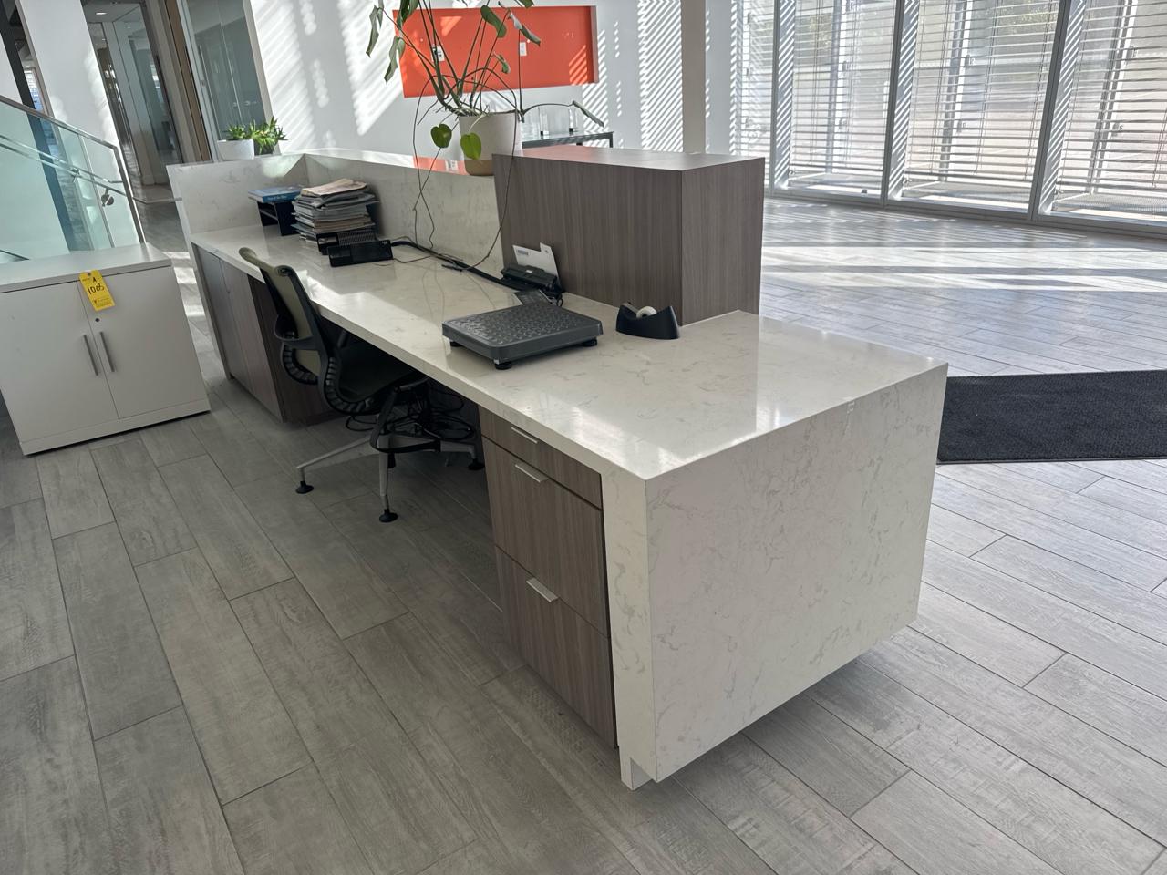 Office furniture, (1) reception desk approximately 144.5 inch length x 35 inch width x 45 inch height, (1) glass table 54 inch length x 2 ft width 30.5 inch height, (1) end table.