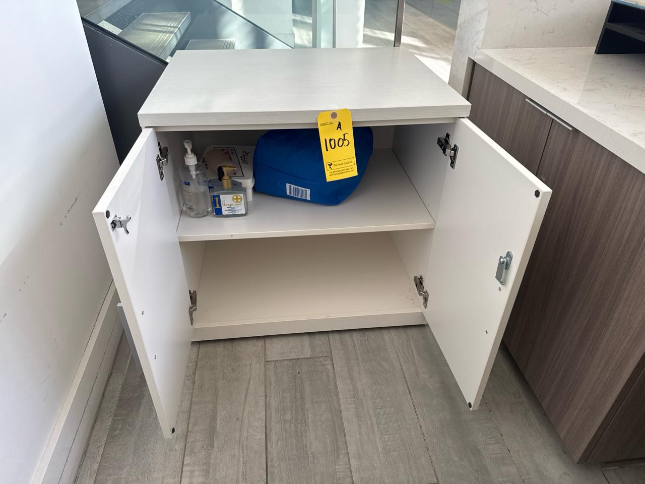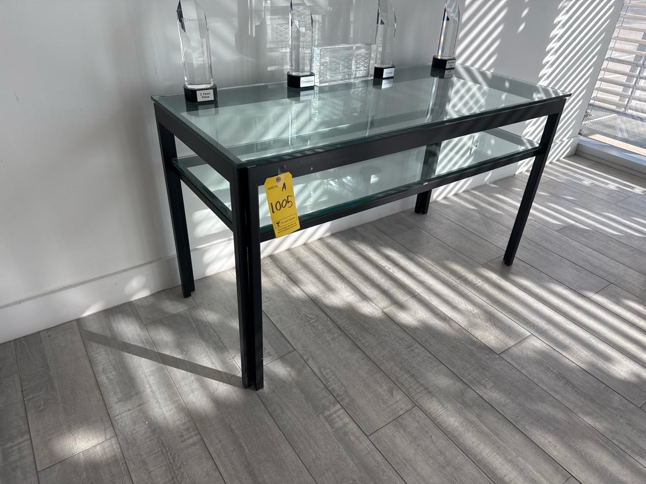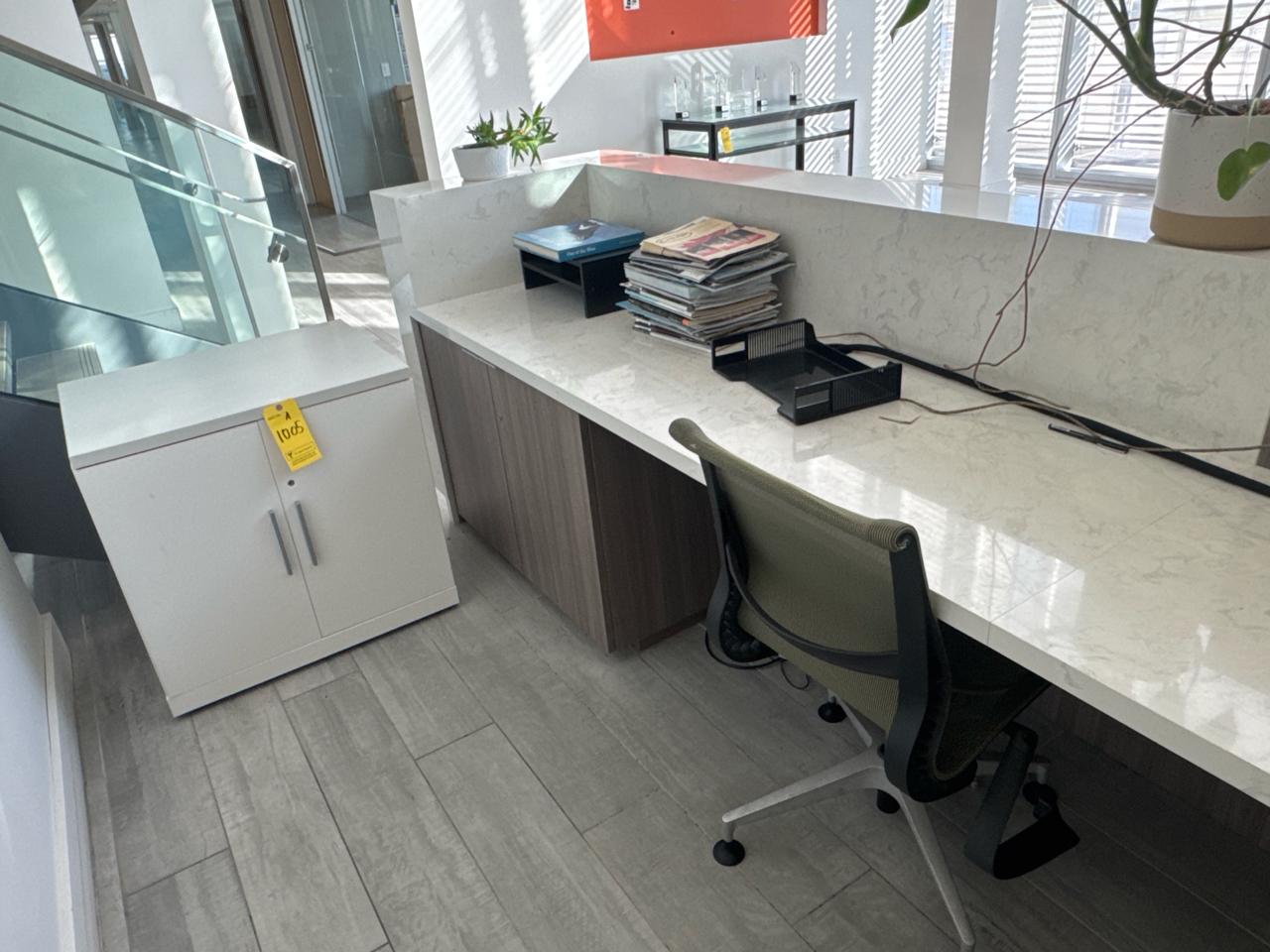 Office furniture, (1) reception desk approximately 144.5 inch length x 35 inch width x 45 inch height, (1) glass table 54 inch length x 2 ft width 30.5 inch height, (1) end table.