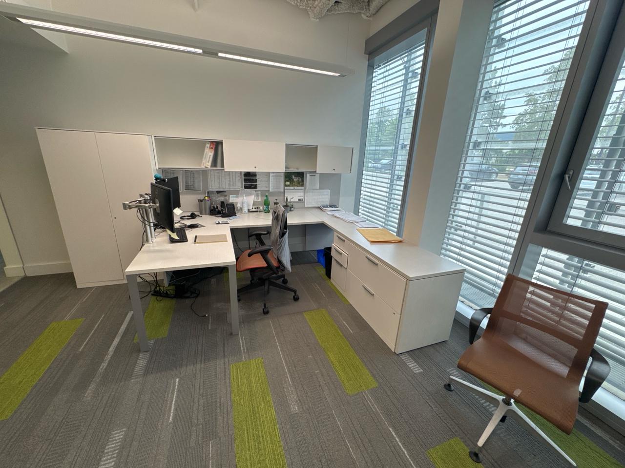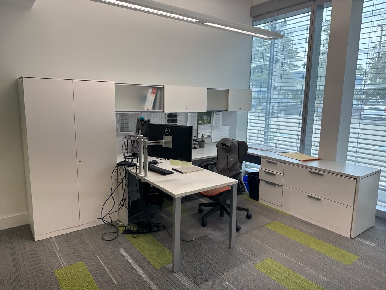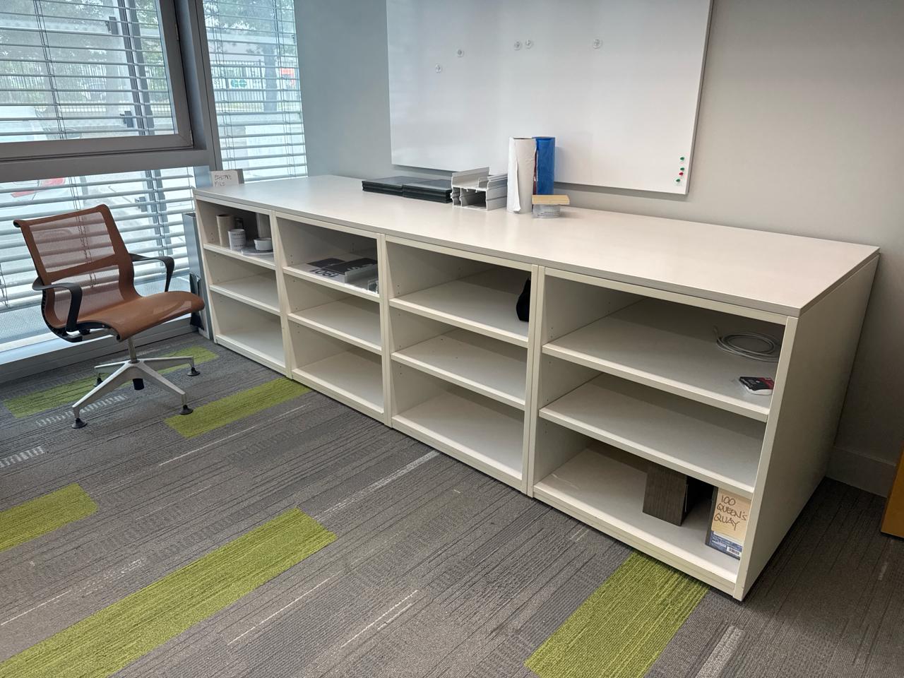 Office furniture, computer table 101 inch length x 8 ft width x 28.5 height, shelving unit 10ft length x 3 ft width x 3 ft height, storage cabinet, office chairs, contents excluded [Main floor]
