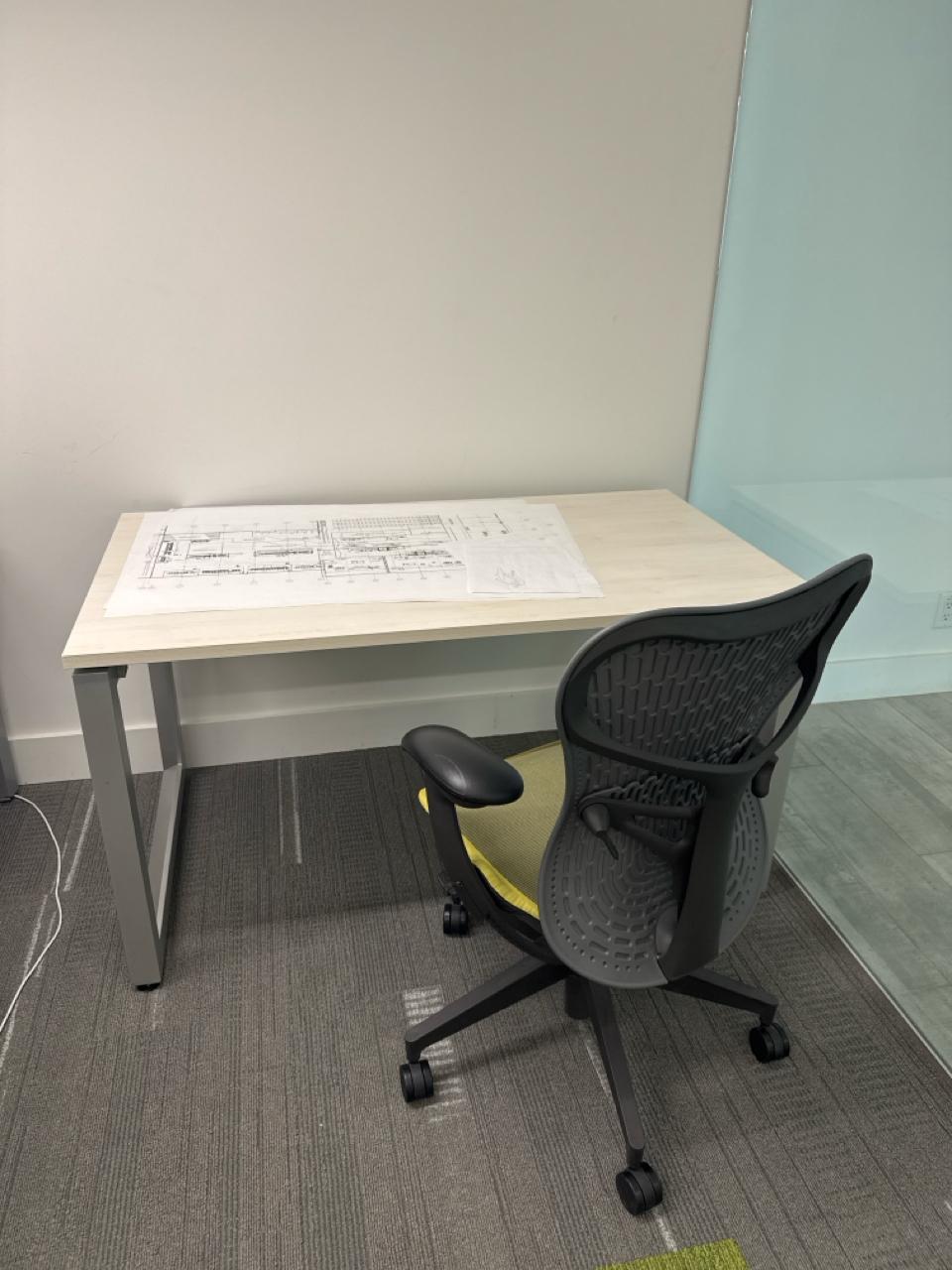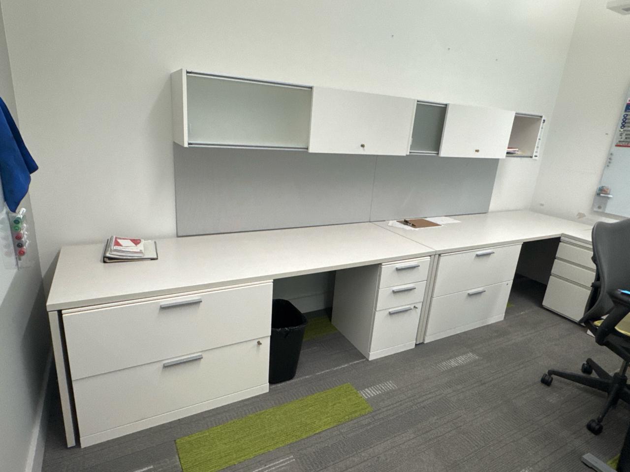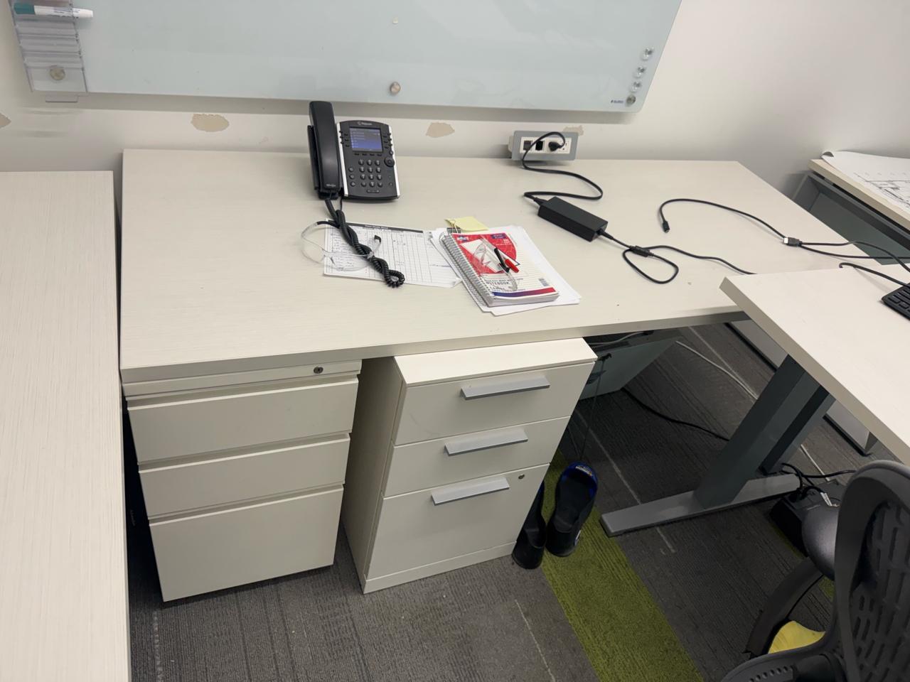 Office furniture, (2) grey table 7ft length x 29 inch width 29 inch height, (1) grey table 6ft length x 29 inch width x 29 inch height, (1) Electric desk 58 inch length x 29 inch width, (1) grey table 54 inch length x 30 inch width x 29 inch height, (2) office chairs contents excluded [Main floor]