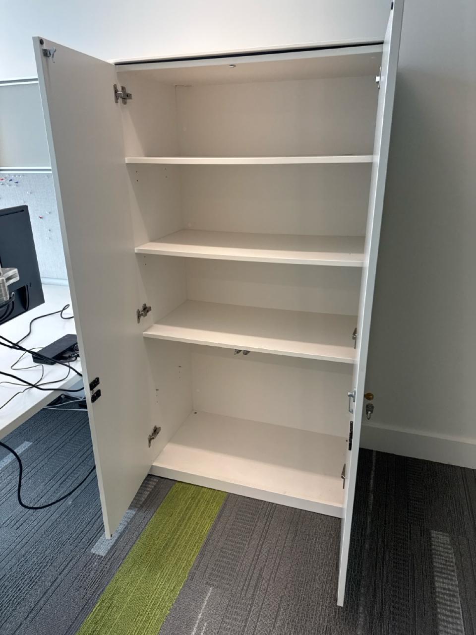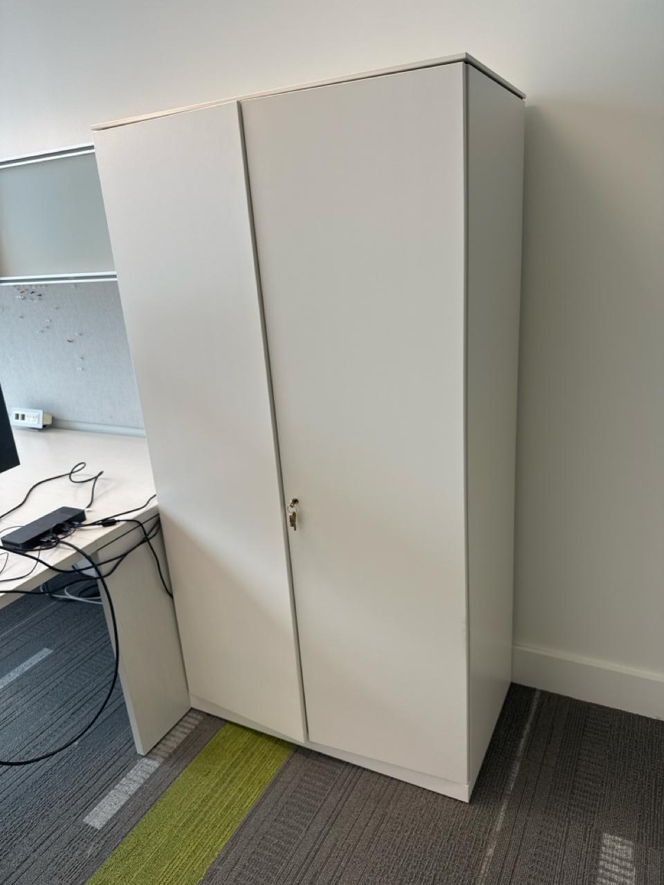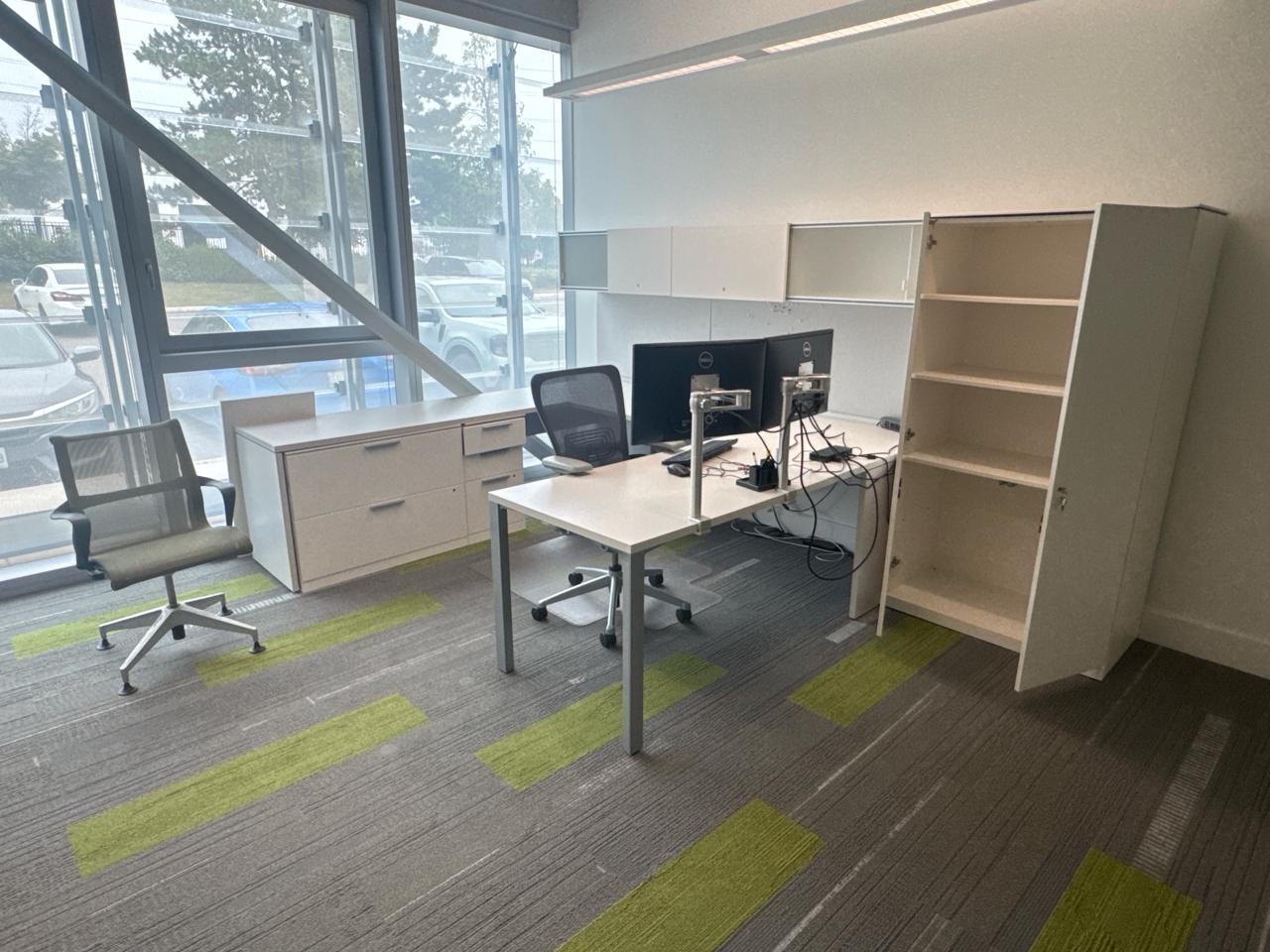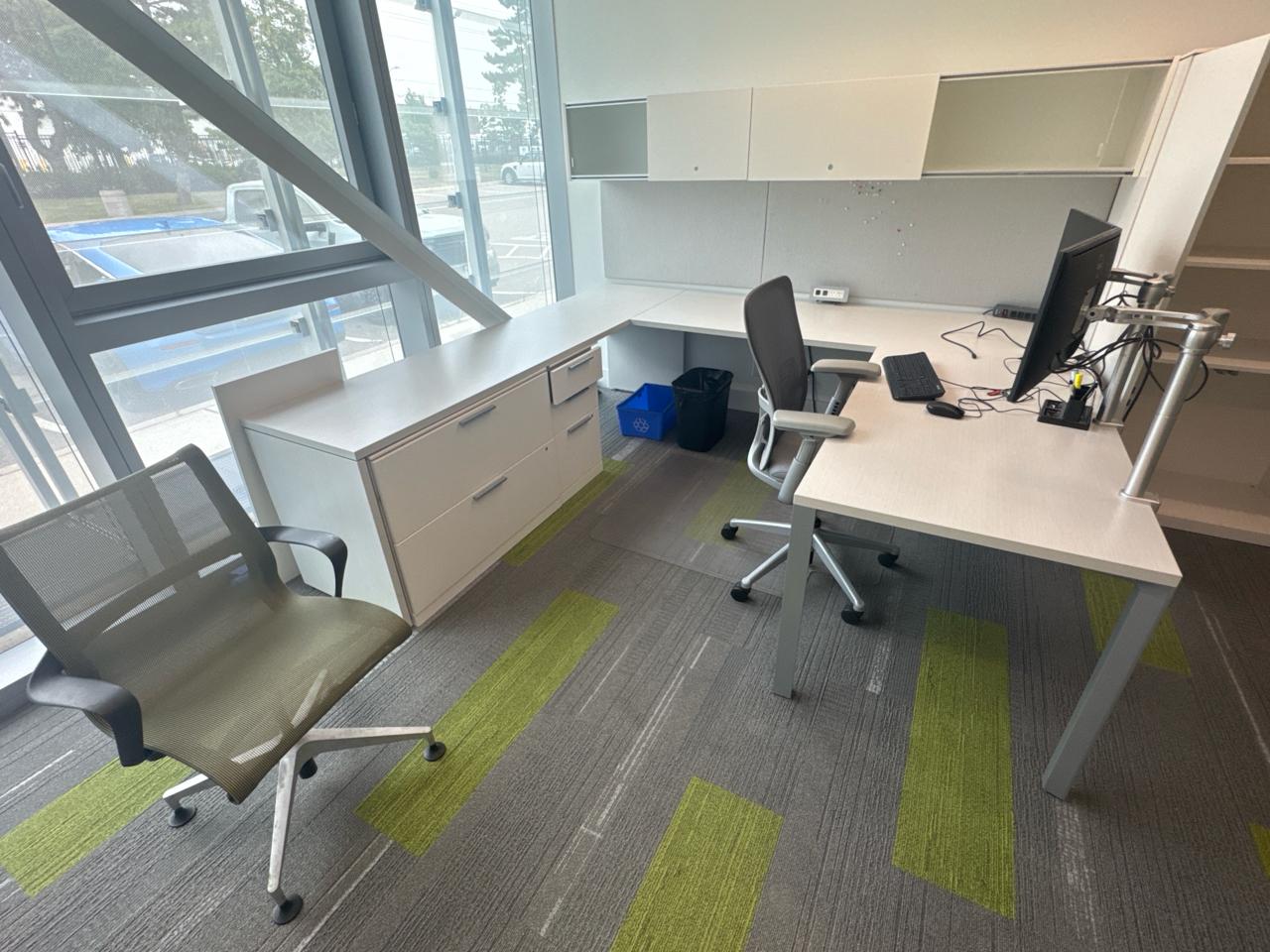 Office furniture, U-shaped desk 8 ft length x 101 inch width x 29 inch height. Cabinet 67 inch height 3 width x 20 inch depth, (2) office chairs. Contents excluded [Main floor]