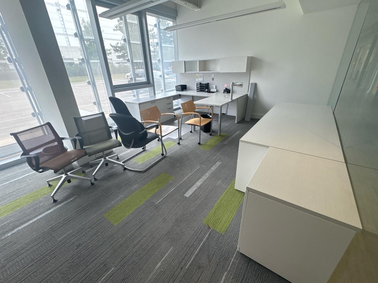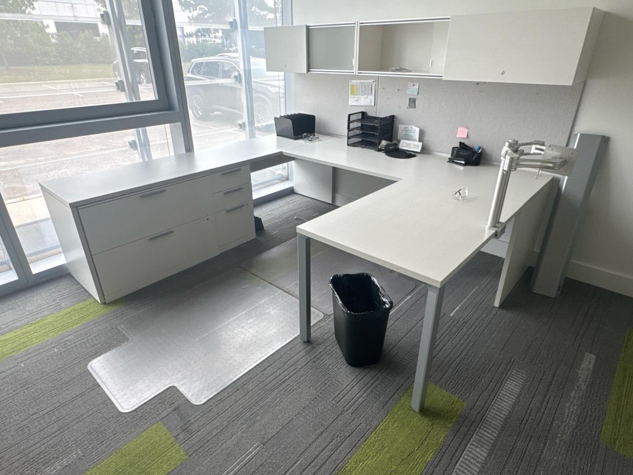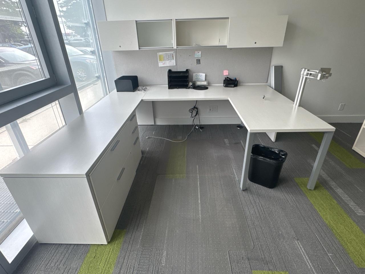 Office furniture, U-shaped desk 8 ft length x 101 inch width x 29 inch height, shelving desk 94 inch length x 3 ft width x 29 inch height, desk cabinet approximately 29.5 inch width x 23.5 depth x 29 inch height, shelving unit, 5 chairs. Contents excluded [Main floor]
