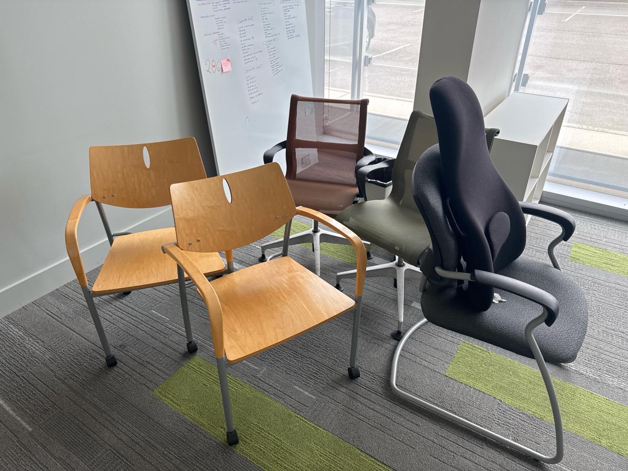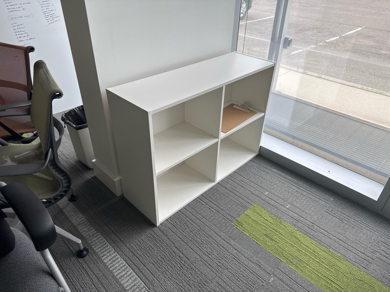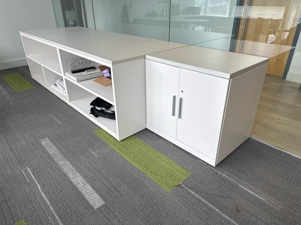 Office furniture, U-shaped desk 8 ft length x 101 inch width x 29 inch height, shelving desk 94 inch length x 3 ft width x 29 inch height, desk cabinet approximately 29.5 inch width x 23.5 depth x 29 inch height, shelving unit, 5 chairs. Contents excluded [Main floor]