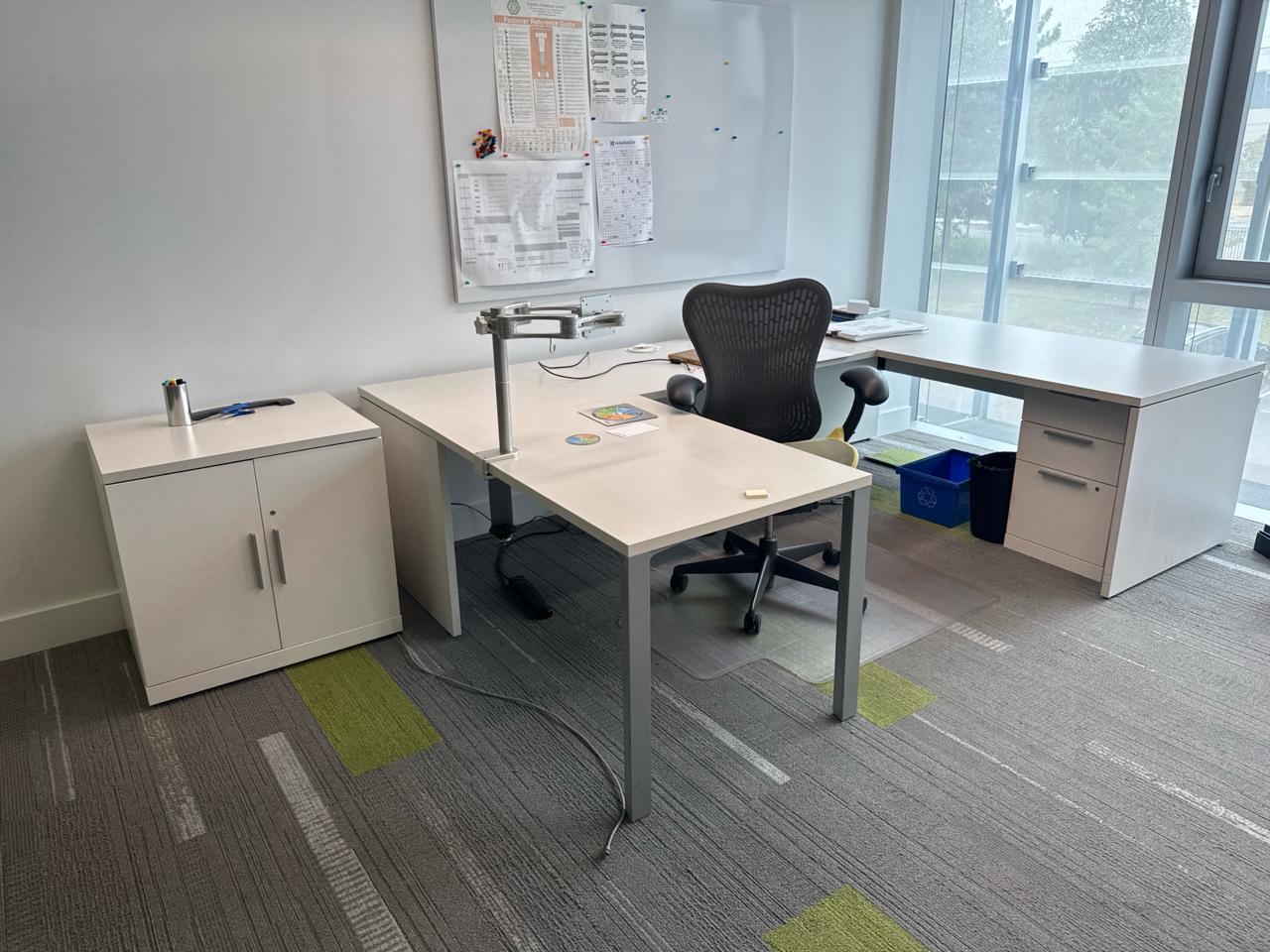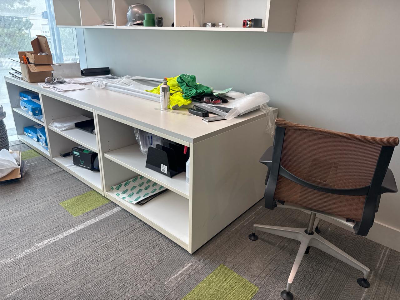 Office furniture, U-Shaped desk 113 inch length x 70.5 inch width x 28.5 height, shelving desk 9ft length x 3 ft width x 29inch height, cabinet desk shelving unit 29.5 length x 23 inch width 29 inch height, (1) office chair, contents excluded [2nd floor Office]