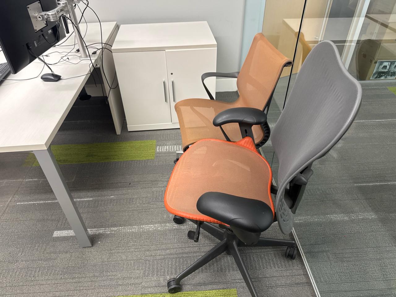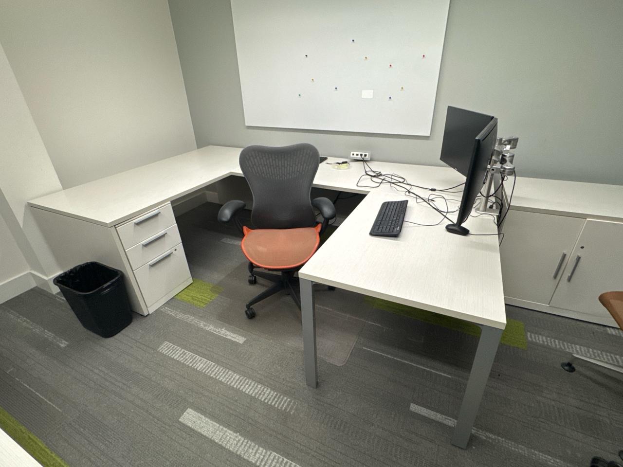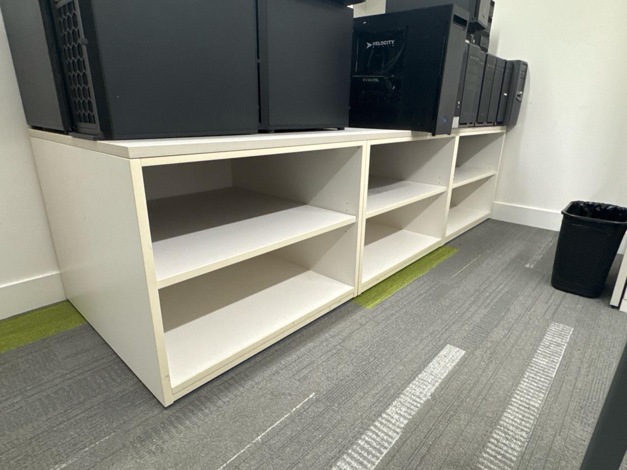 Office furniture, U-Shaped desk 113 length x 6ft width x 28.5 inch height, shelving desk unit 9ft length x 3ft height x 29 inch height, Cabinet shelving unit 29.5 length x 23 inch width x 29inch height, (3) chairs, contents excluded [2nd floor Office]