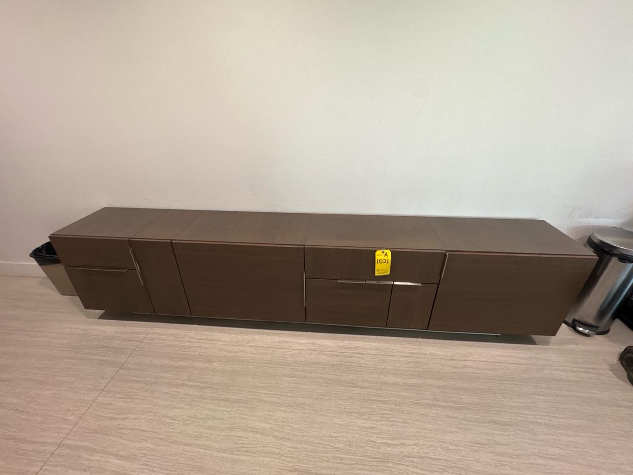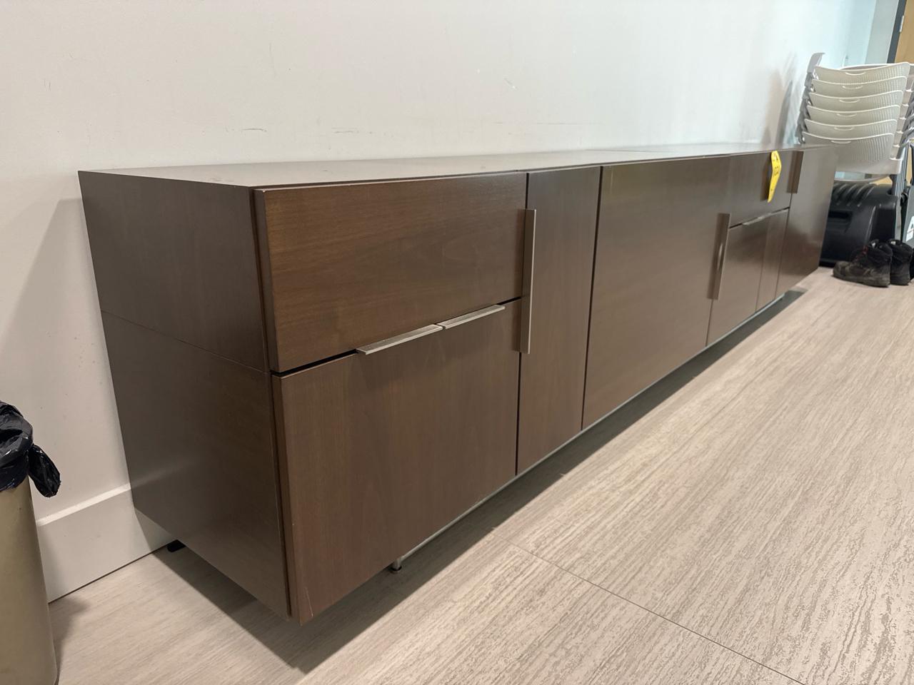 Office Furniture, Brown credenza approximately 118 inch length x 18 inch width x 26.5 height. [Main floor]