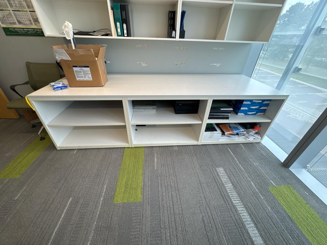 Office furniture, shelving desk unit 108.5 inch length 3ft width x 29inch height. Contents excluded. [2nd floor Office]